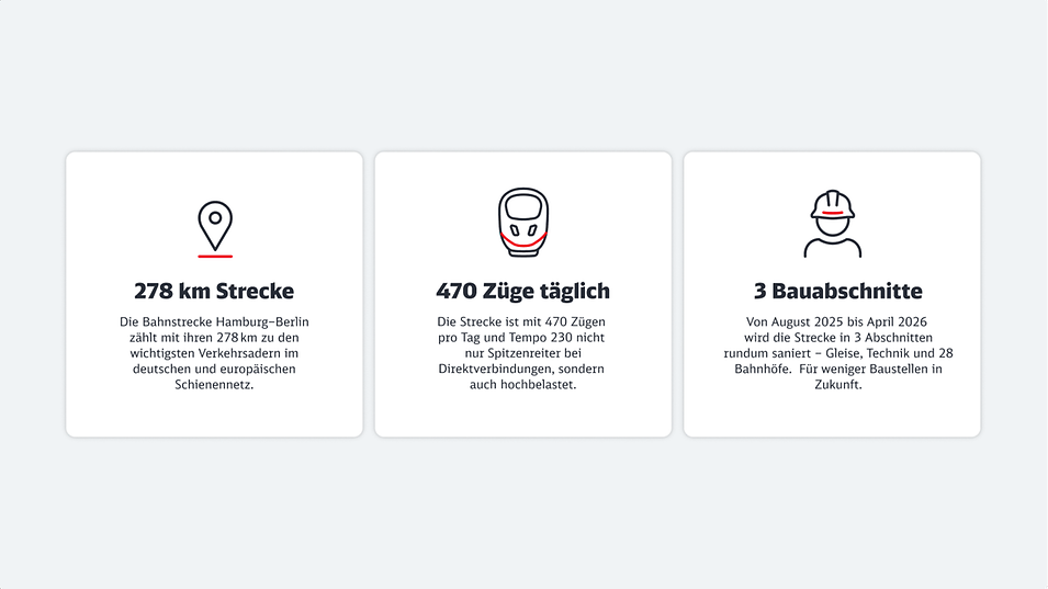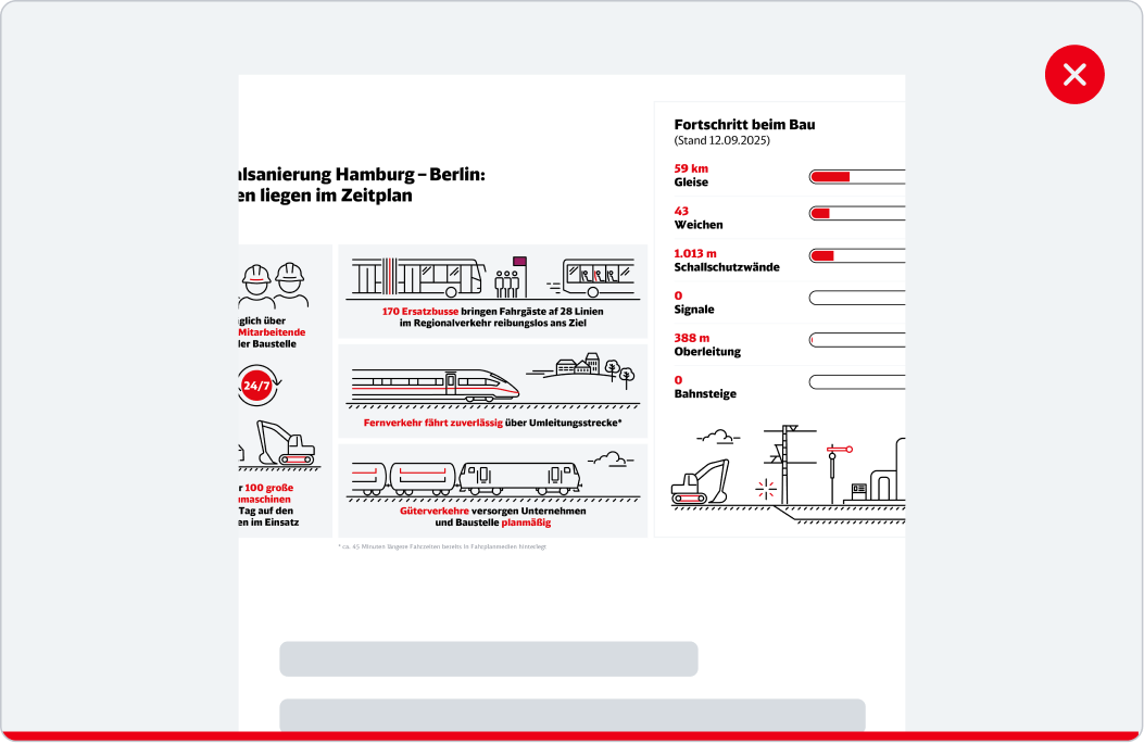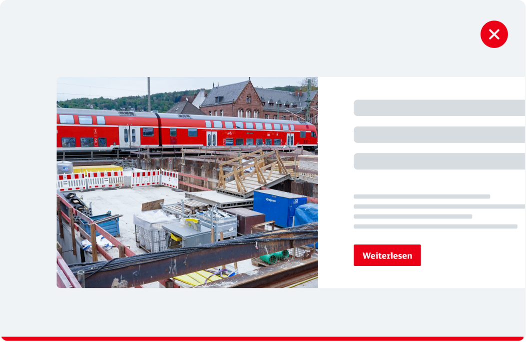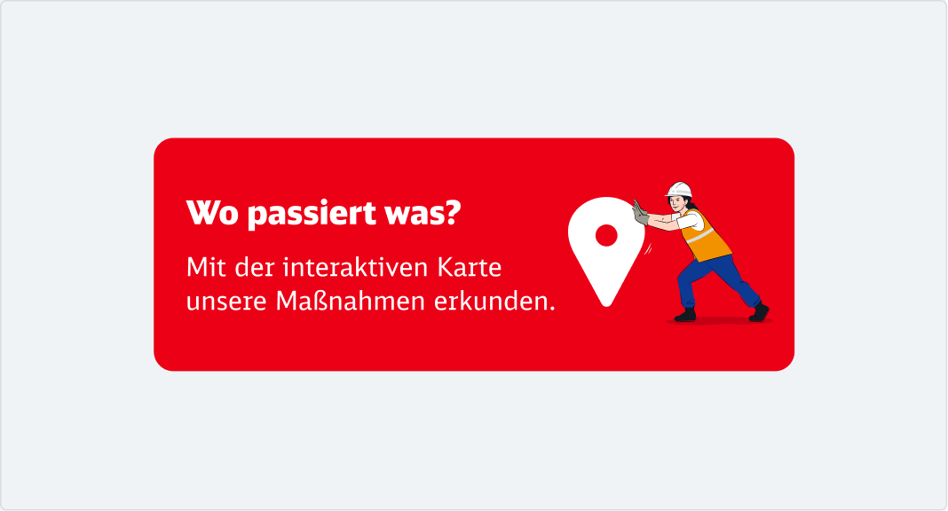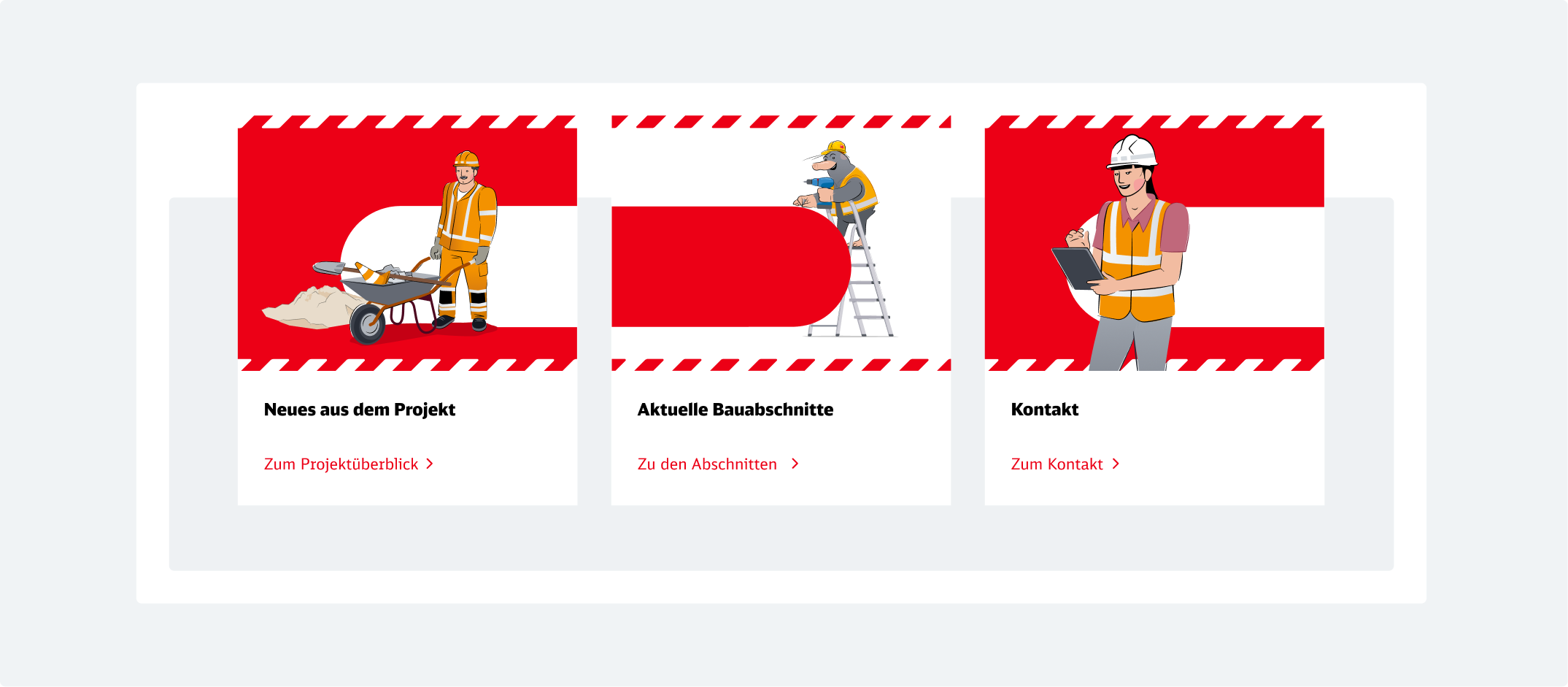 Die Websites stellen Informationen zu den Baumaßnahmen transparent und jederzeit zugänglich für Reisende, Anwohnende und Interessierte bereit. Die Inhalte sollen verständlich aufbereitet sein, zur Interaktion anregen und mithilfe von Storytelling-Formaten Einblicke in die Baustelle ermöglichen. Dadurch wird das Thema Bauen greifbarer und emotionaler vermittelt. Auf die Aktualität der Inhalte ist dabei stets zu achten. Interaktive Module, wie Steckbriefe, kombiniert mit Illustrationen und dem Flatterband aus der Baukommunikation, machen Themen zugänglicher, interaktiver und auffälliger.