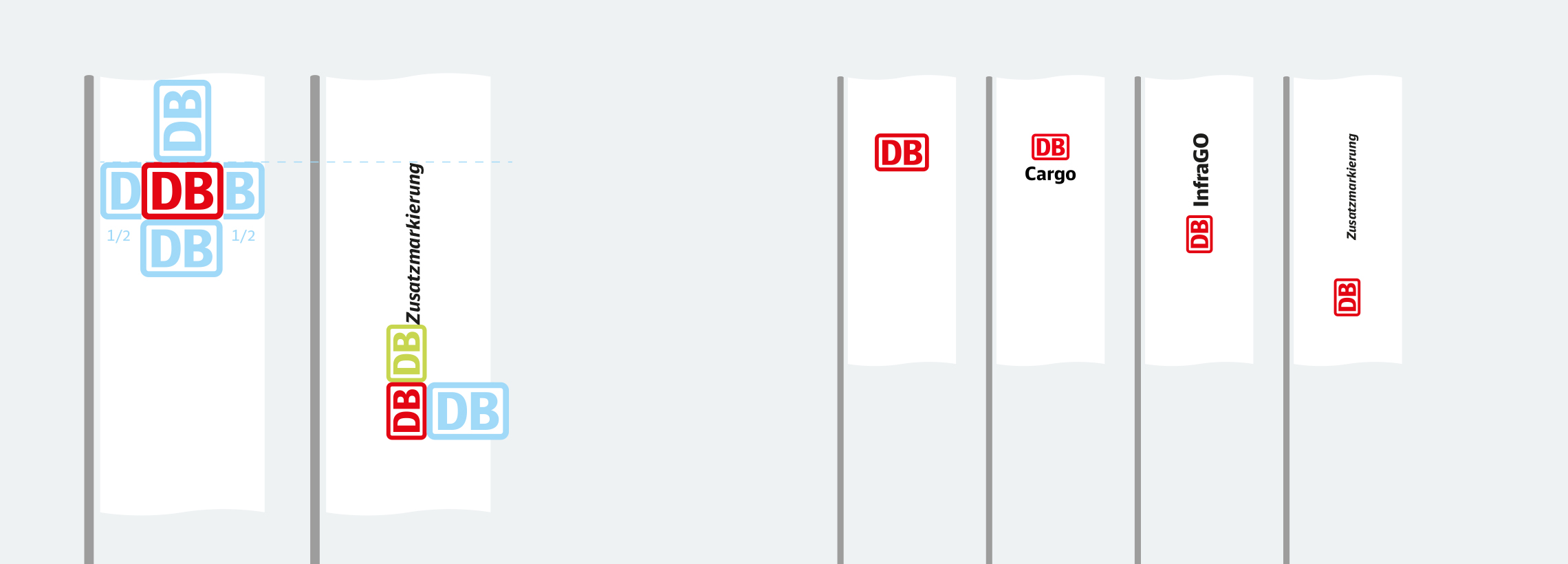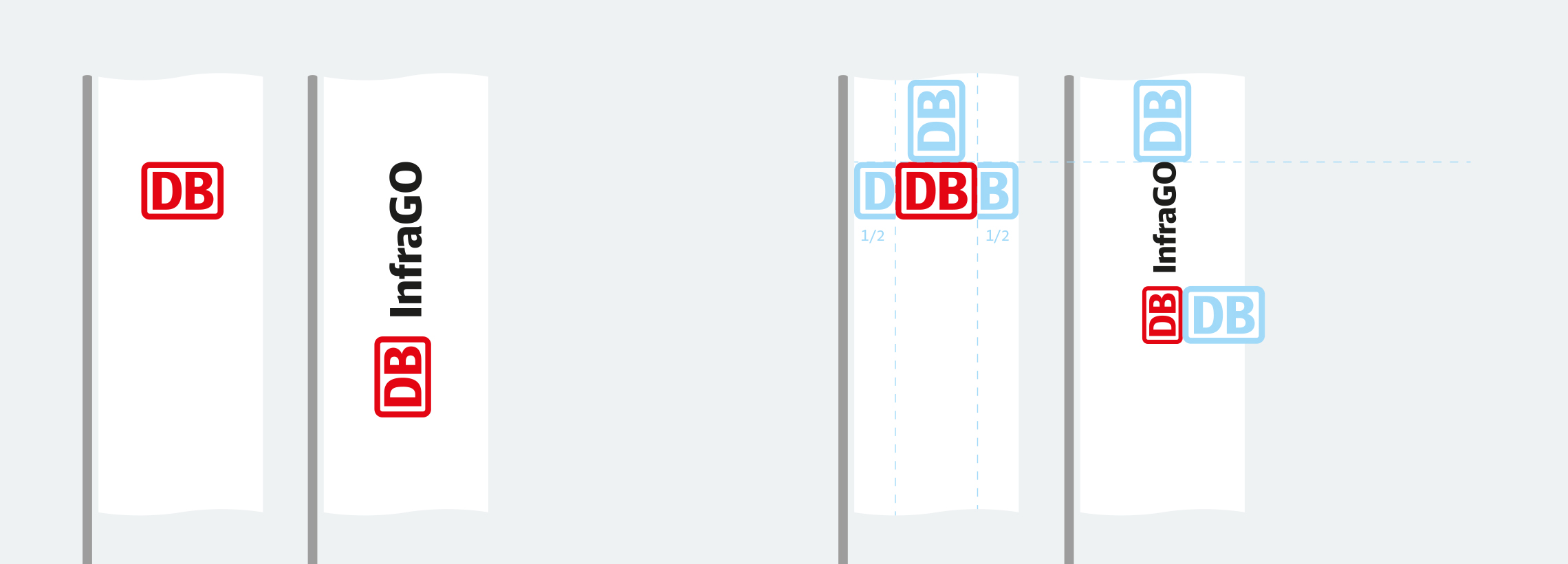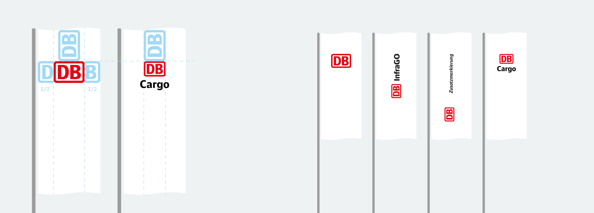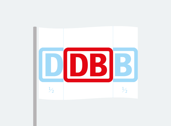Die Abstände und Größendefinitionen sind aus dem Aufbau der DB-Fahne und DB-Geschäftsfelder-Fahnen abgeleitet, so dass die Fahnen in der Kombination ein harmonisches Gesamtbild ergeben.