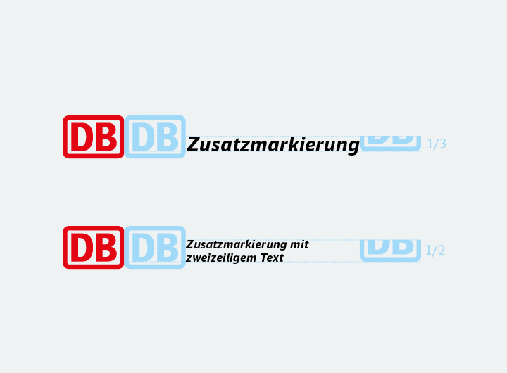 Nutze für Zusatzmarkierungen die DB Sans Alternate Bold Italic. Abstand und Größenverhältnis zum DB-Logo sind fest definiert. Bei langen Zusätzen kannst du den Text auch zweizeilig setzen. Weitere Informationen und Gestaltungsprinzipien zum Thema Zusatzmarkierungen findest du hier.