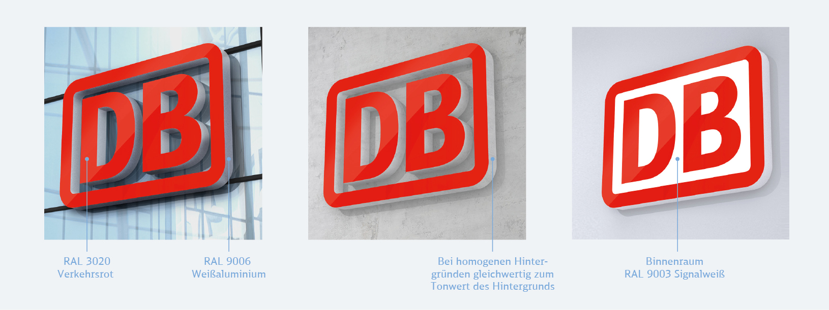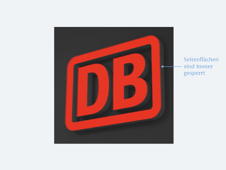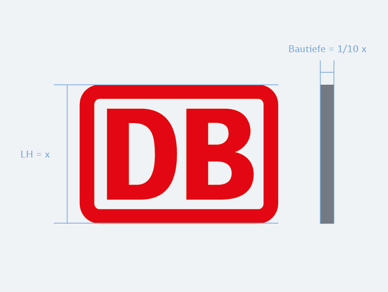 Das Logo ist grundsätzlich DB Rot und die Seiten in RAL 9006 Weißaluminium lackiert. Bei homogenen Hintergründen kannst du die Seitenflächen gleichwertig zum Tonwert des Hintergrundes ausführen. Bei sehr unruhigen Hintergründen ist das Logo mit weißem Binnenraum auszuführen.