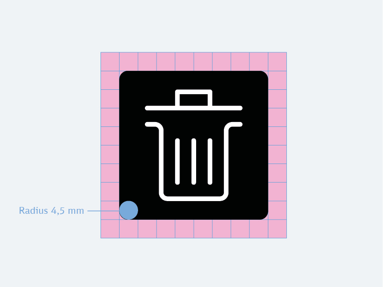 Achte immer auf konsistente Größenverhältnisse und Strichstärken je nach Anwendungsbereich. Für große Anwendungen werden die Icons ohne Hintergrundfläche aufgebracht. Bei kleineren Hinweisen stehen die Icons auf einer Fläche mit abgerundeten Ecken.