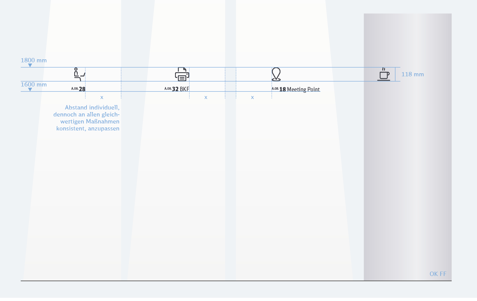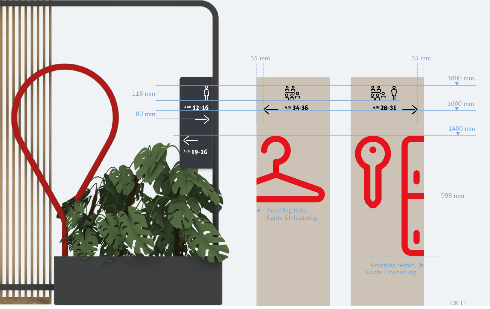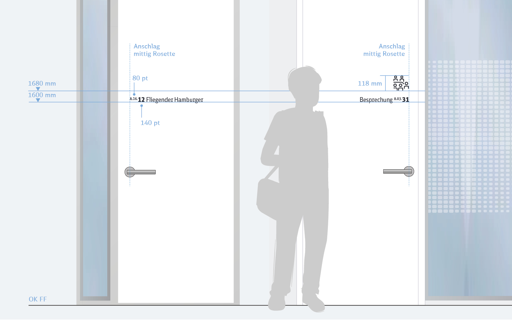 Das betrifft sowohl die schlüssige und einprägsame Codierung und Clusterung von Informationen, als auch sinnvolle Größenverhältnisse, Positionierung sowie durchgängige (barrierefreie) Montagehöhen (1600 mm ab Oberkante Fertigfußboden / OK FF) und Farbgebung.