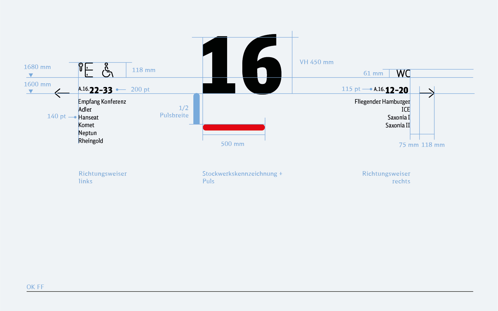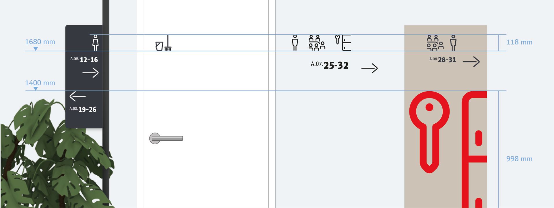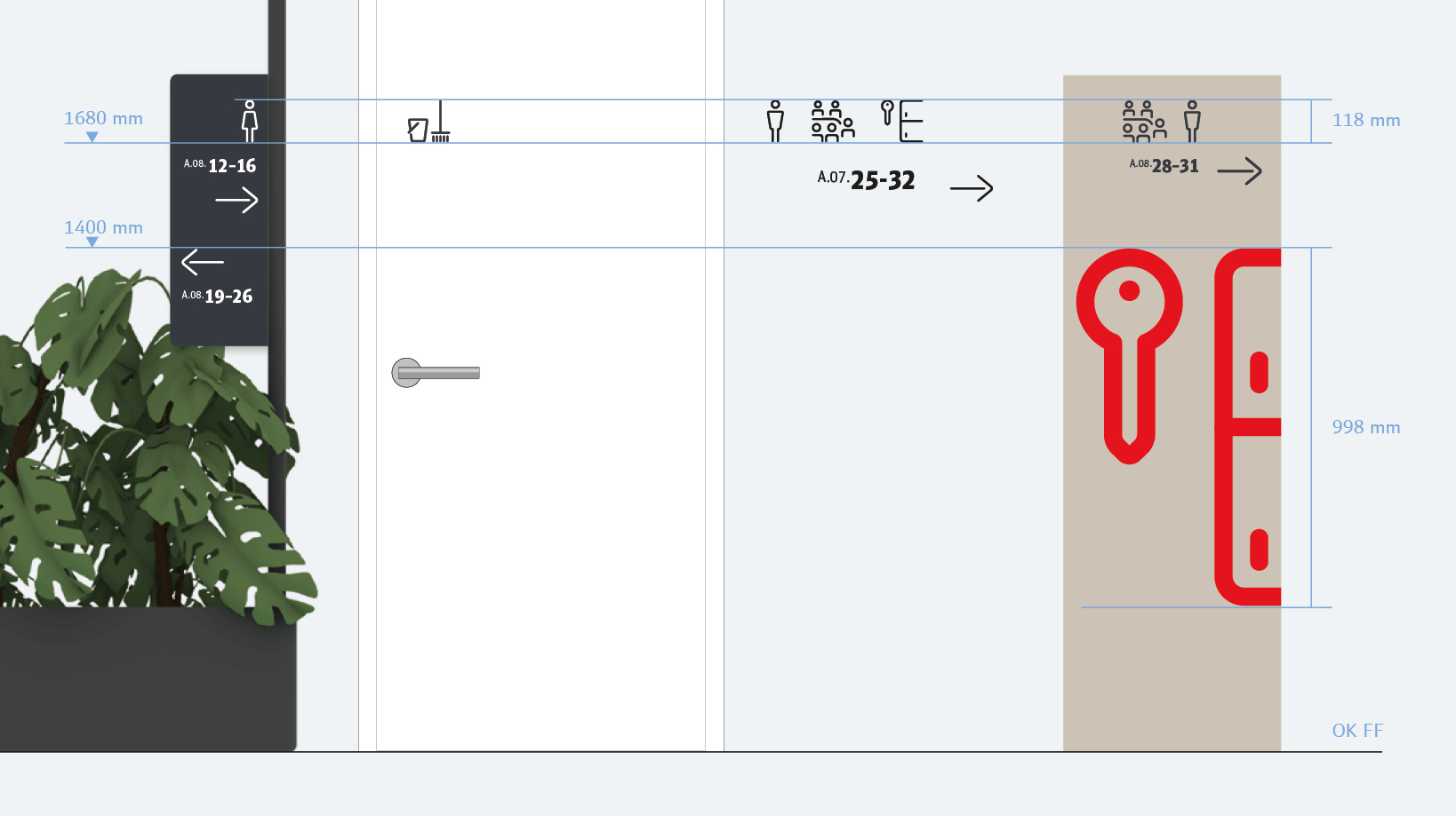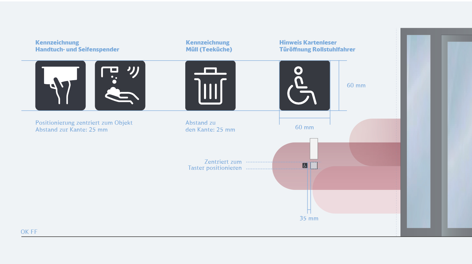 Das betrifft sowohl die schlüssige und einprägsame Codierung und Clusterung von Informationen, als auch sinnvolle Größenverhältnisse, Positionierung sowie durchgängige (barrierefreie) Montagehöhen (1600 mm ab Oberkante Fertigfußboden / OK FF) und Farbgebung.