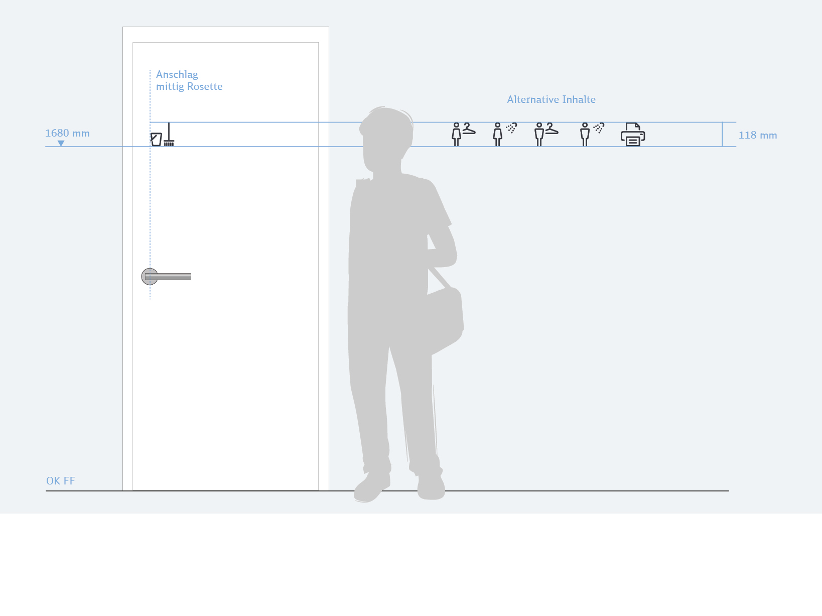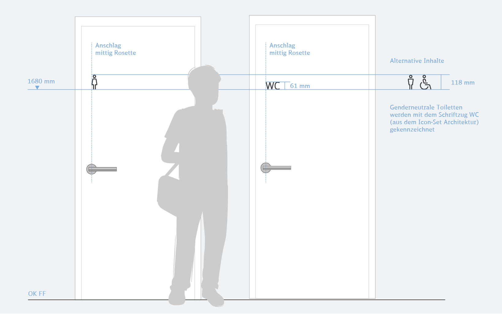 Toiletten und Nebenräume werden in der Regel nur mit einem Icon gekennzeichnet. Die Ausrichtung und Höhenlinie ist identisch zu den Räumen mit Raumnummer auf dem Türblatt.