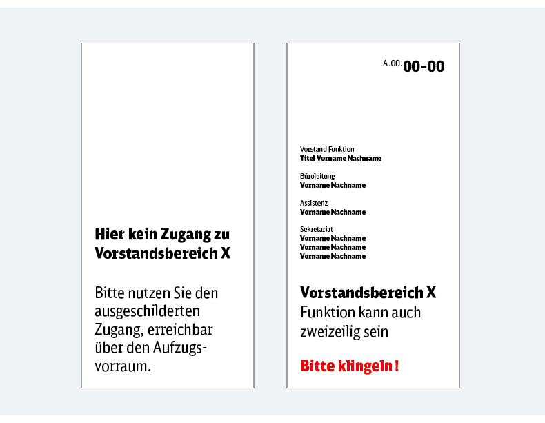 Stelle die Schriftgrößen in ein sinnvolles Verhältnis, abhängig von Botschaft und Funktion der Kommunikation. Achte bei der Planung und Gestaltung auf logische Informationshierarchien und Gliederungen sowie gute Lesbarkeit unter Berücksichtigung des jeweiligen Betrachtungsabstandes. Passe die Größen, Verhältnisse und Positionierung individuell auf das Gebäude an.