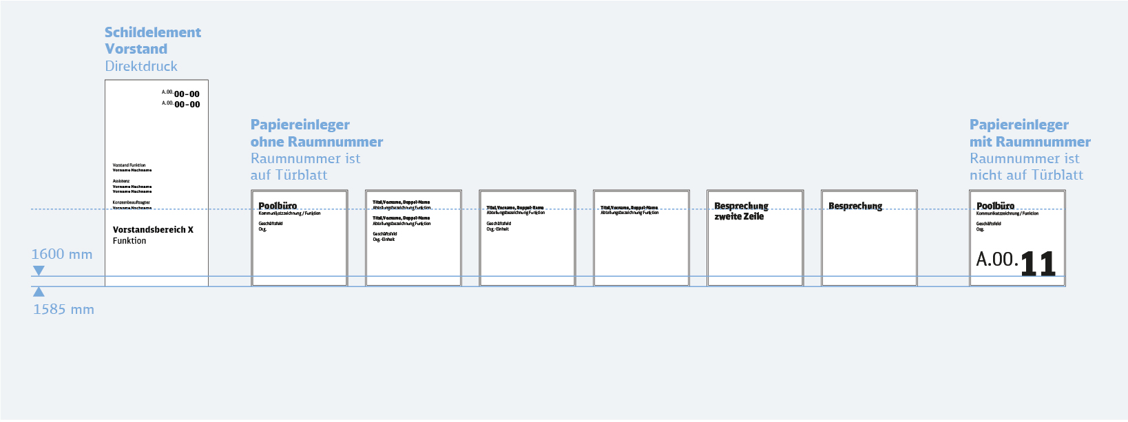 Speziell im Bahntower gab es den Wunsch, durch häufige Umbauten und Fluktuation, einige Räume nicht direkt auf dem Türblatt zu kennzeichnen. In diesem Sonderfall wird die Raumnummer nicht auf dem Türblatt angebracht, sondern auf dem Raumschild. Die Platzierung erfolgt immer auf der sich öffnenden Seite, also dort, wo sich auch die Türklinke befindet.