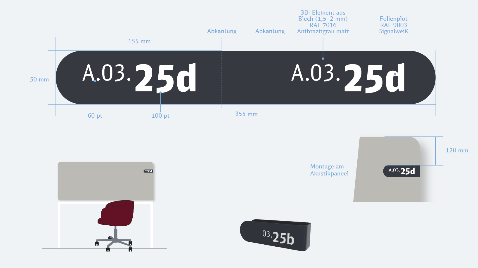 Da jedes Gebäude neue Anforderungen hat, empfehlen wir dir vor Ort eine Bemusterung, um minimale und maximale Schriftgrößen zu definieren und eine optimale Lesbarkeit zu garantieren.