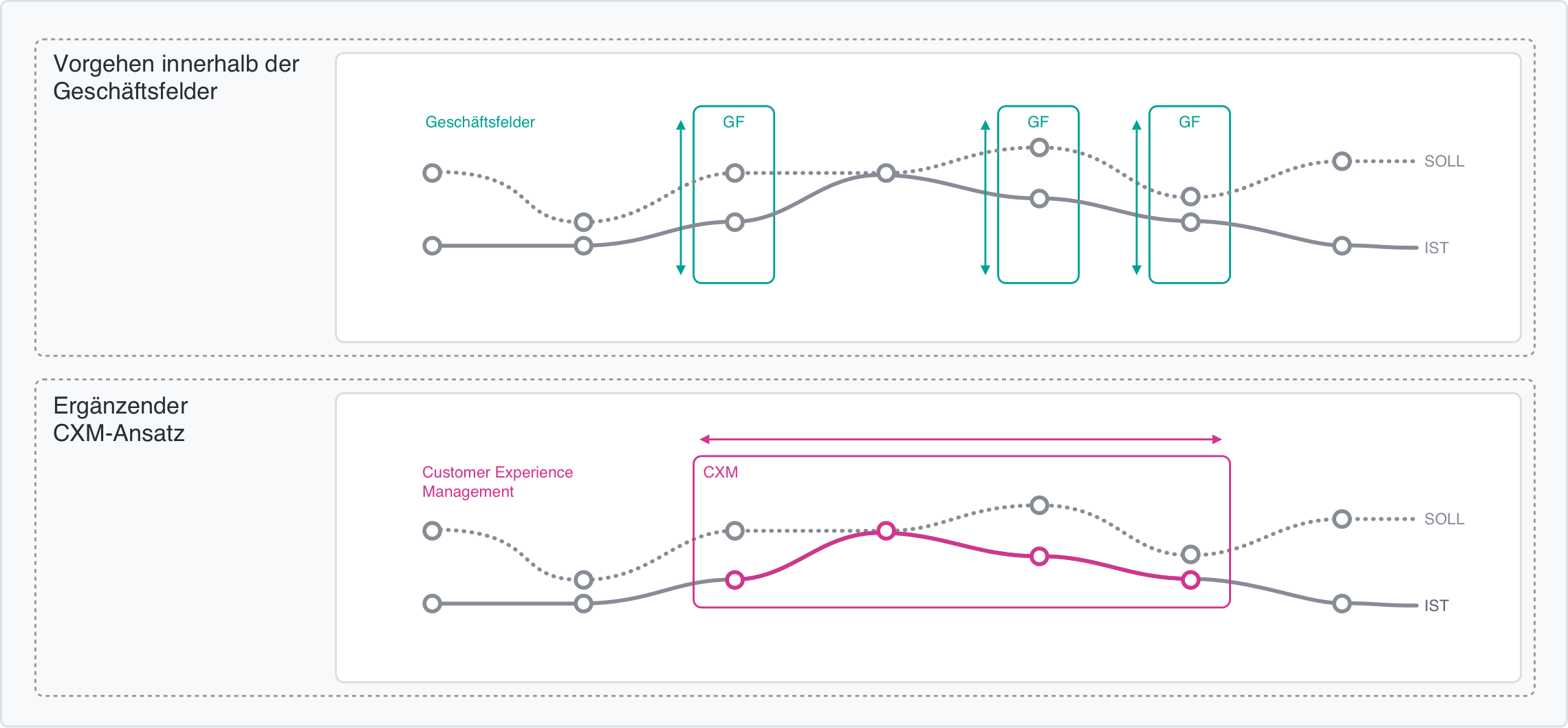 Mit dem ergänzenden CXM-Ansatz erfolgt die Priorisierung nach wesentlichen Treibern der Gesamtzufriedenheit entlang der Reisekette, wodurch gesamthaft schlüssige Maßnahmen geschäftsfeldübergreifend verabschiedet und eingeführt werden.