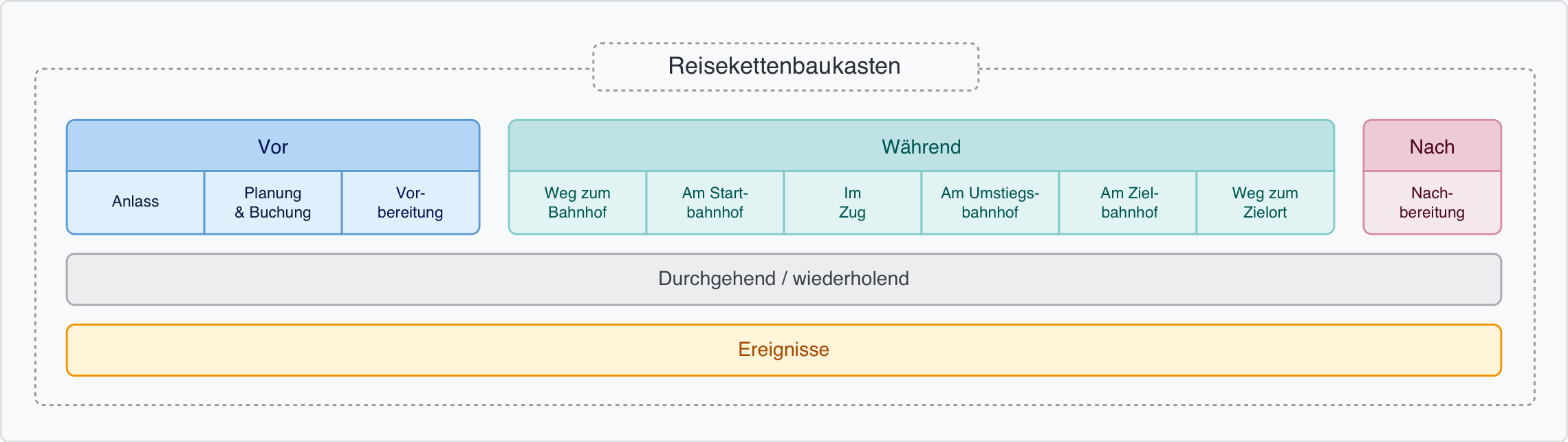 Die einzelnen Module des Baukastens bilden die wichtigsten Phasen und Handlungen einer personenverkehrs- und schienenzentrischen Reise ab und beschreiben die wesentlichen Handlungen der Mehrheit aller Reisenden.