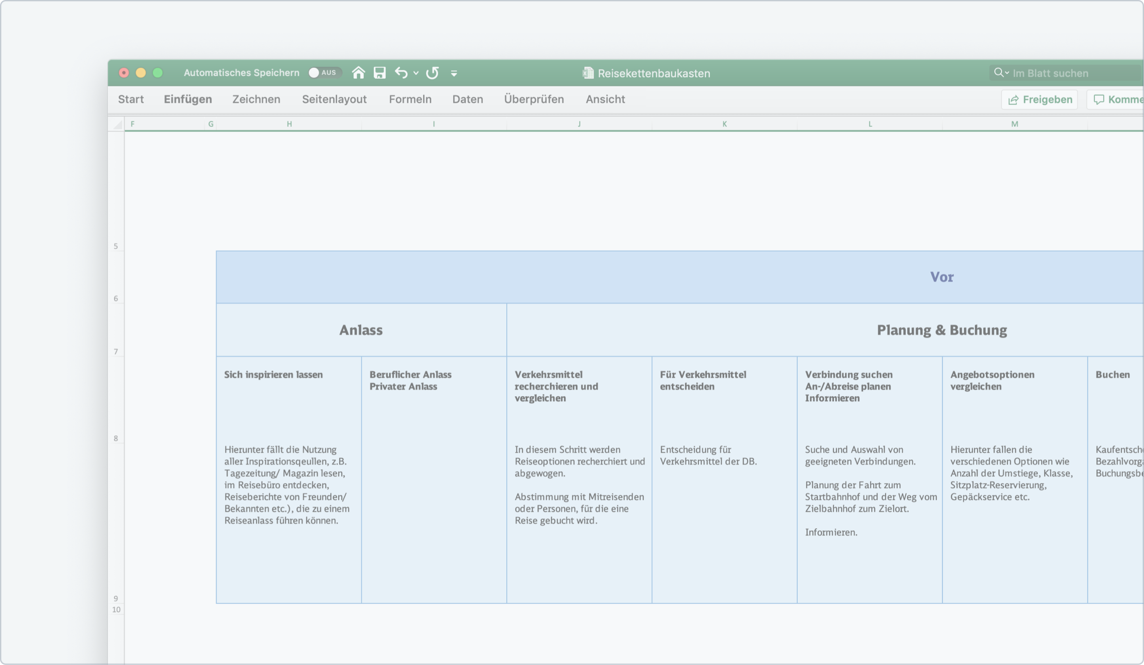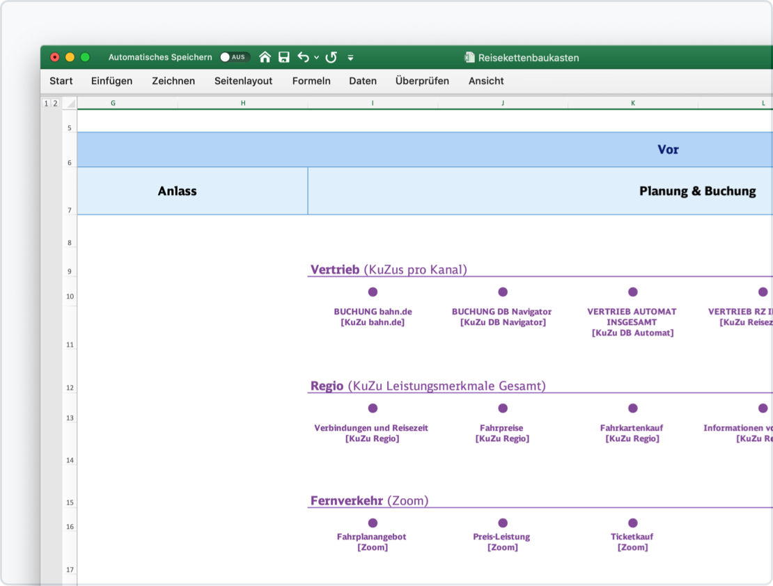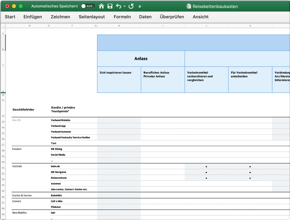 Entlang von Reiseketten können Kanäle und Touchpoints verortet werden, um die Verteilung von Angeboten der Geschäftsfelder sichtbar zu machen und Maßnahmen gezielt über mehrere Geschäftsfelder hinweg koordinieren zu können.