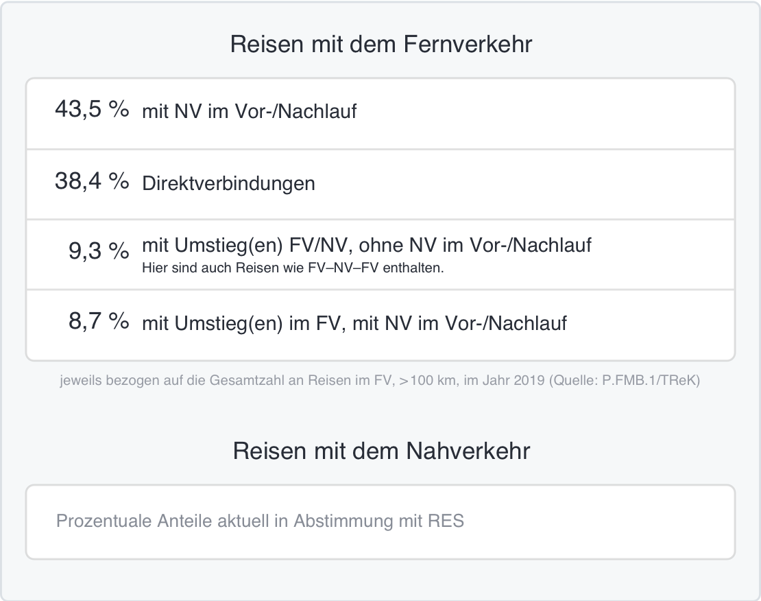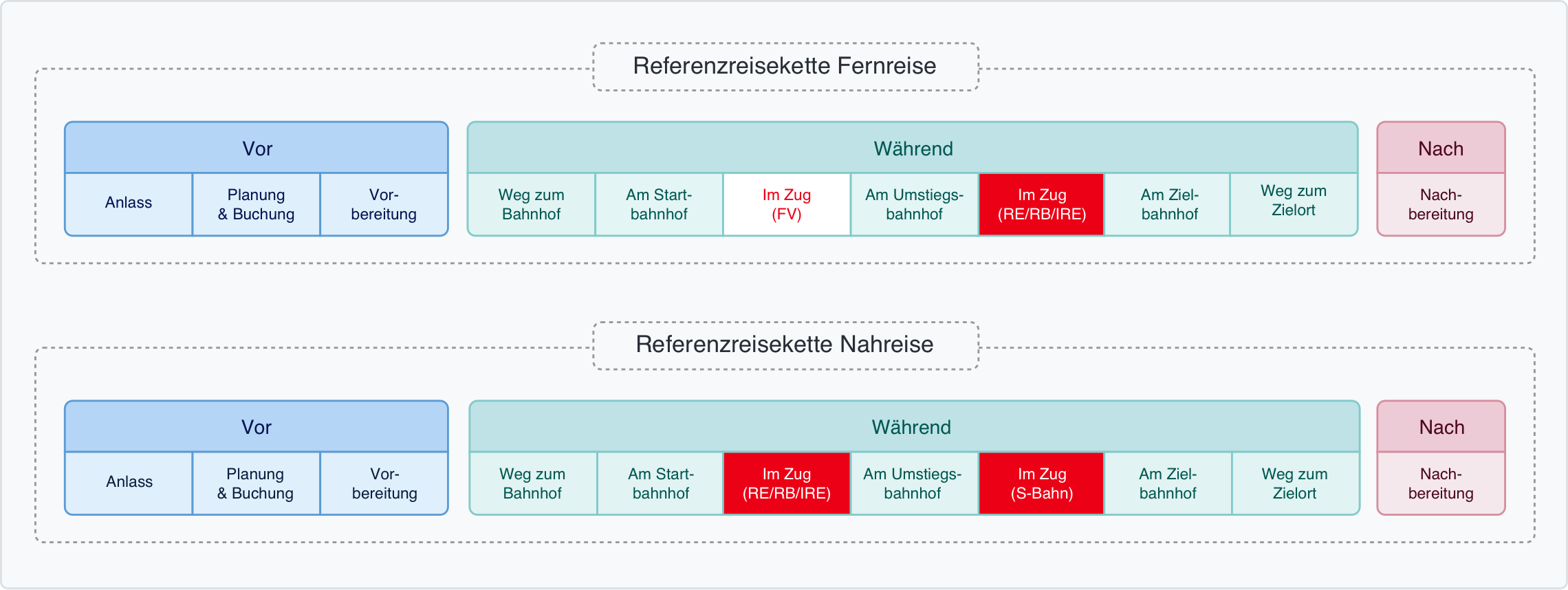 Die schienenzentrischen Referenzreiseketten Fernreise und Nahreise (letztere als Teil der Alltagsmobilität) bilden für den Personenverkehr der Deutschen Bahn die häufigsten Geschäftsvorfälle ab. Die Referenzreiseketten sind geschäftsfeldübergreifend und unabhängig von Zielgruppen, Anlass oder Ticketart aufgebaut: