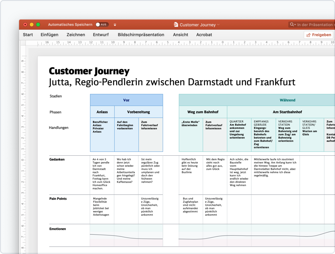 Customer Journeys beschreiben auf Basis der Reisekette die Experience eines tatsächlichen Kunden / einer Persona in einer konkreten Situation über verschiedene Kontaktpunkte mit einem oder mehreren Produkten und Services als IST- oder SOLL-Journey.