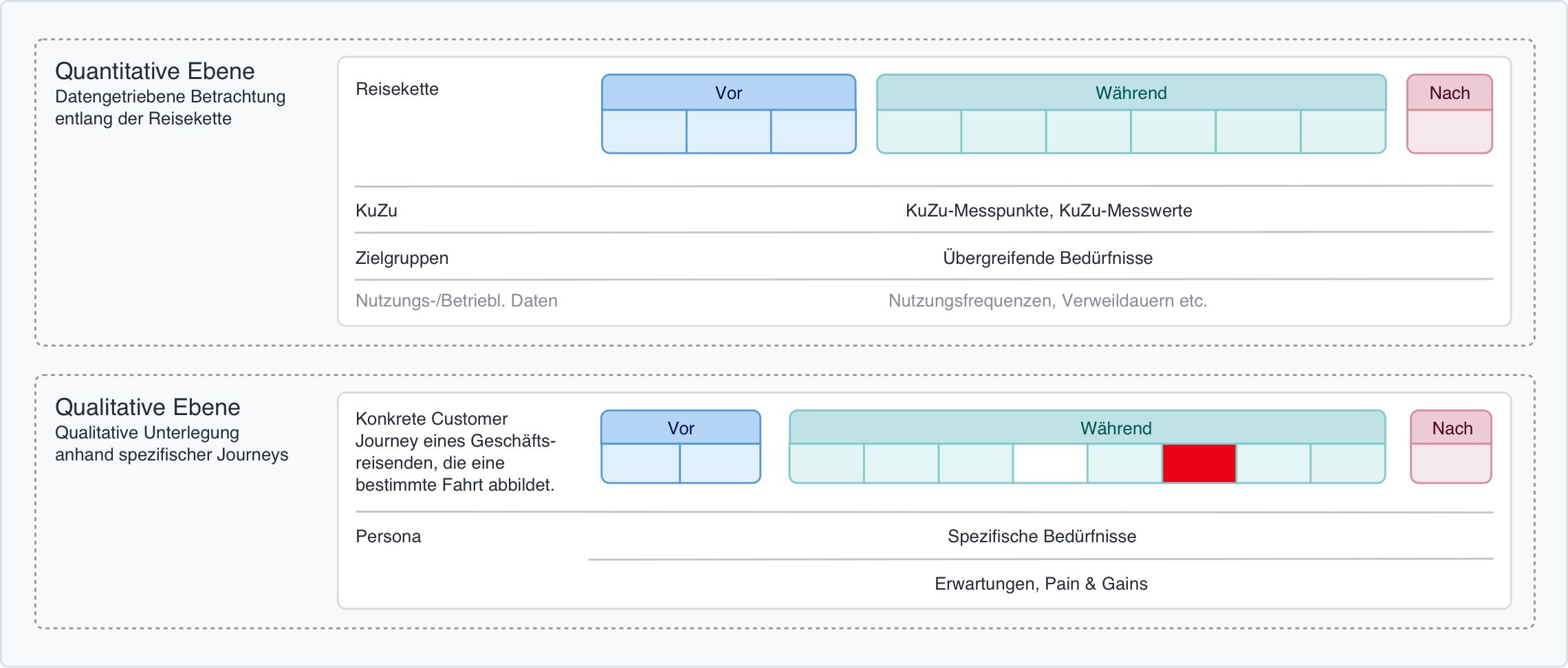 Die Erkenntnisse der Studienberichte werden auf die erarbeiteten Referenzreiseketten – explizit auf deren Phasen und Handlungen – verortet. Dabei werden verschiedene Level berücksichtigt: allgemein gültige, möglichst übergreifende Bedürfnisse und Pain Points und zielgruppenspezifische Bedürfnisse und Pain Points