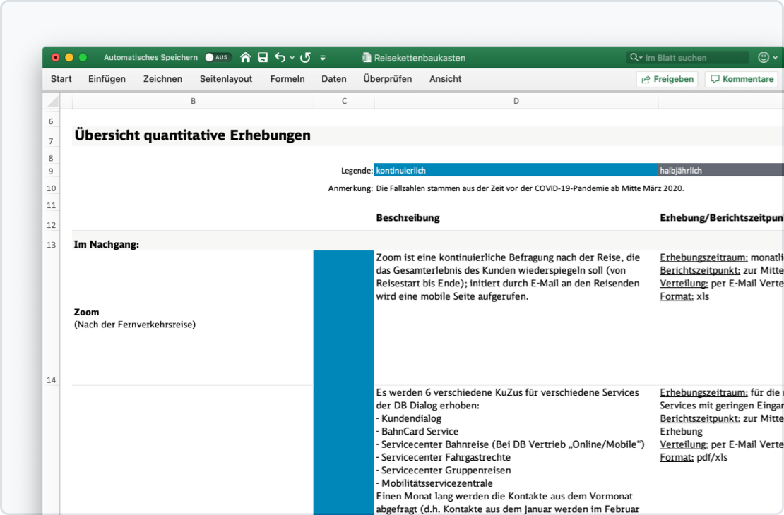 Generell werden die Fragebögen regelmäßig von den Geschäftsfeldern überarbeitet und ergänzt, so dass die Zuordnungen auf die Reisekette sich auch verändern können.