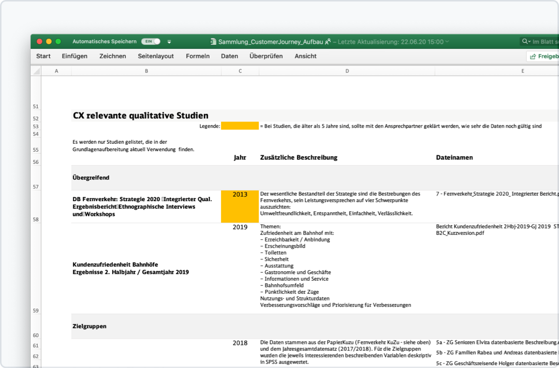 Ein wichtiges Kriterium für die Aufnahme von Studien in die Sammlung ist, dass das Erlebte direkt von Kund:innen kommt, sprich Kund:innen haben sich zum Beispiel durch Interviews, Workshops oder der Teilnahme an Umfragen der Deutschen Bahn mitgeteilt.