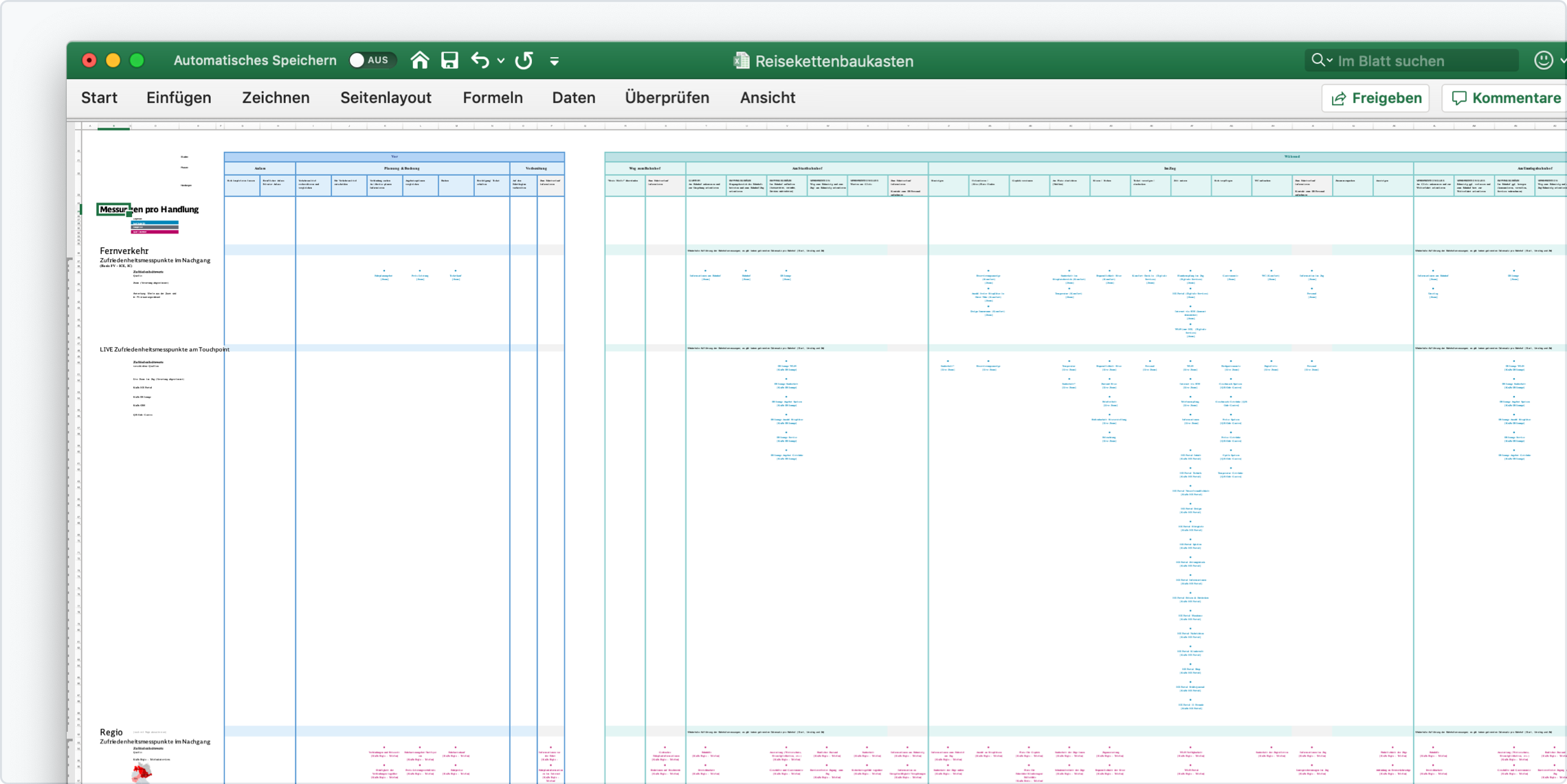 Es gibt diverse Kundenzufriedenheitsmessungen (KuZus) der Geschäftsfelder im Personenverkehr. Wir haben diese auf den Reisekettenbaukasten verortet, um sichtbar zu machen, wo aktuell Daten zur Zufriedenheit in Form von Zufriedenheits-Indizes (ZIs) erhoben werden. Dadurch wird deutlich, dass die Reiseketten nahezu vollständig ausgeleuchtet werden. Wenn bei einzelnen Handlungen keine Messungen vorliegen, kann dies auch bedeuten, dass eine kontinuierliche Befragung nicht sinnvoll ist und punktuelle Erhebungen ausreichen.