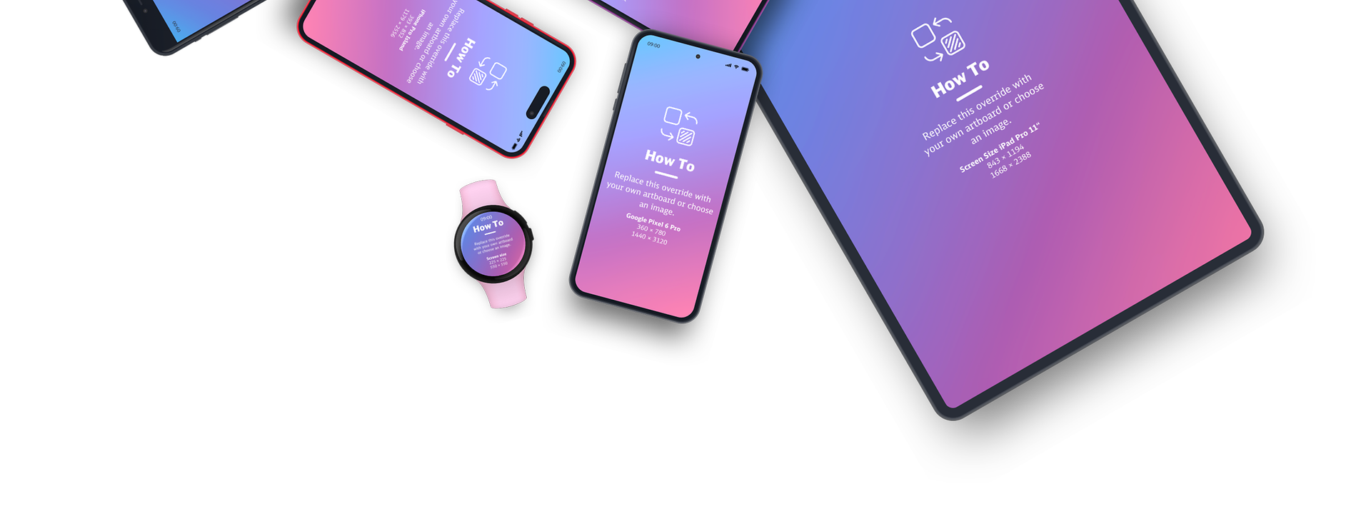 Wir stellen eine komplette Sammlung von pixelgenauen Geräte-Mockups mit leicht austauschbaren Hintergrundbildern bereit, die in PowerPoint, Sketch, Figma, Illustrator und InDesign anwendbar sind. Alle Geräte sind einfärbbar* sowie vollständig vektorisiert und stufenlos skalierbar*.