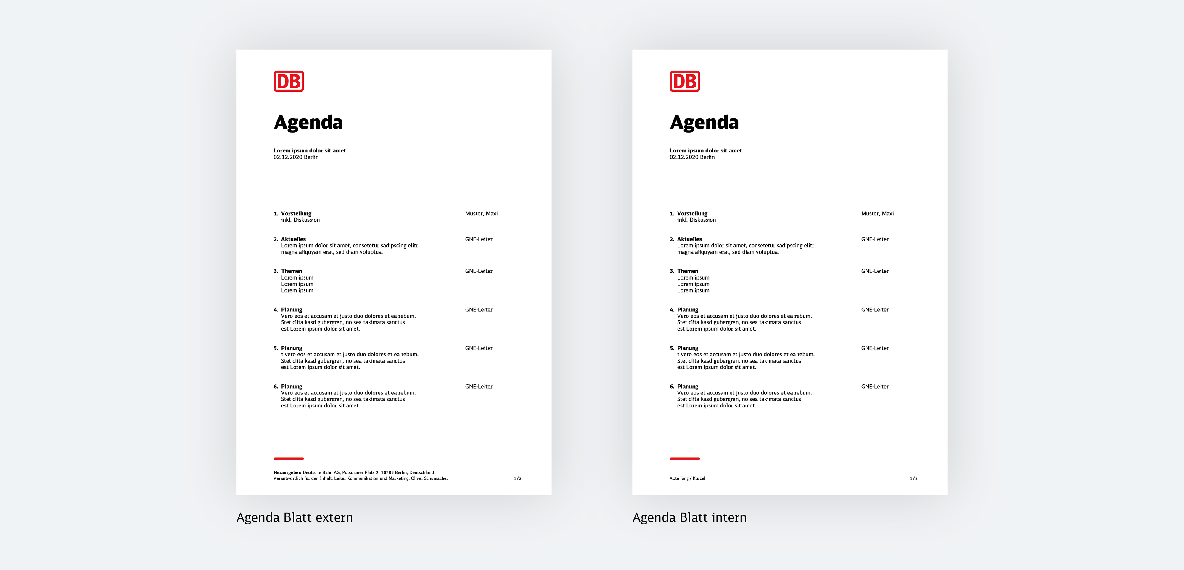 Die Inhalte unserer Agenda sind linksbündig ausgerichtet. In der Marginalspalte ist Platz für einen Personen Hinweis vorgesehen. Unsere Agendablätter liegen in zwei Varianten vor. Sie unterscheiden sich in der Fußzeile. Das externe Agendablatt gibt den Hinweise auf Herausgeber und Adresse. Die interne Agenda hat einen Verweiß auf die jeweilige Abteilung mit Kürzel. Das jeweilige Template findest du in unserem Download-Bereich.