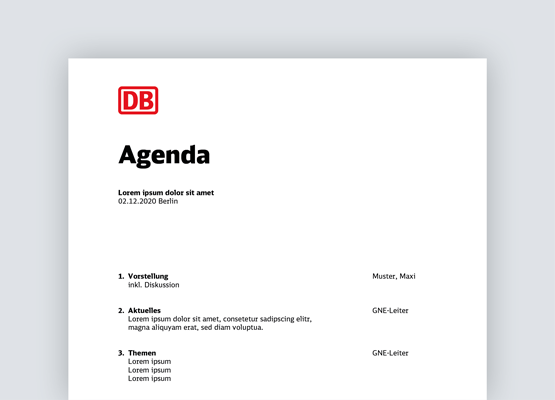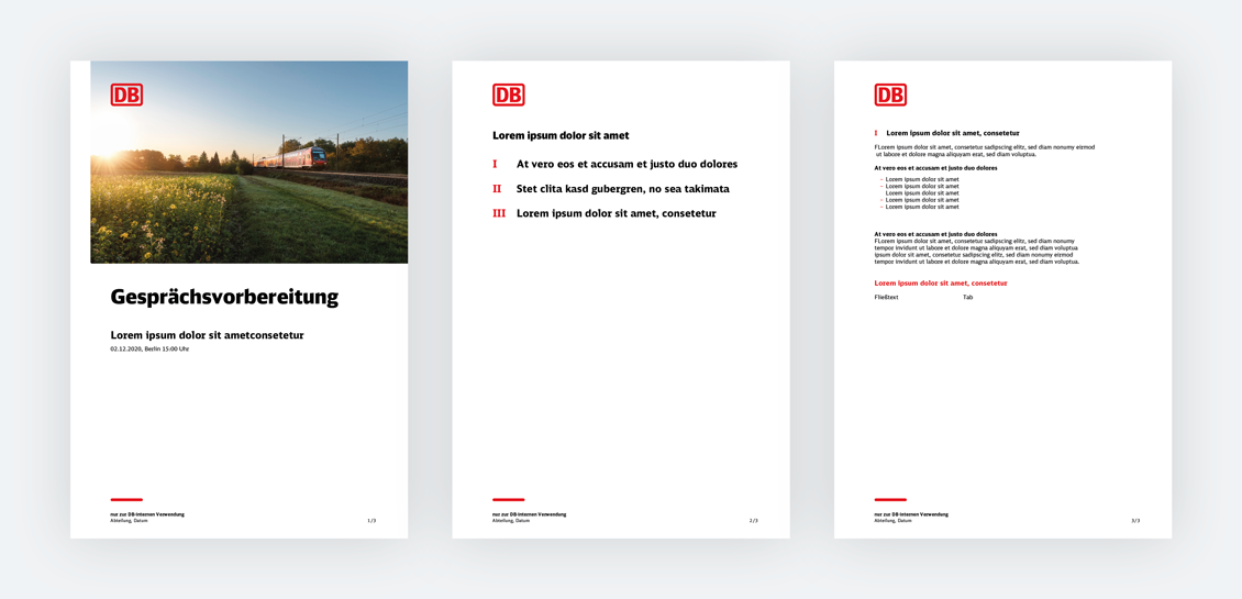 Unsere Gesprächsvorbereitung besteht aus Titelblatt mit Bild, einem Inhaltsverzeichnis und den Inhaltsseiten. Die Texte sind linksbündig ausgerichtet. Hervorhebungen sind in DB Rot möglich. Das passende Word-Template und eine Anleitung für einen unkomplizierten Einsatz des Titelbildes stellen wir im Download-Bereich zur Verfügung.