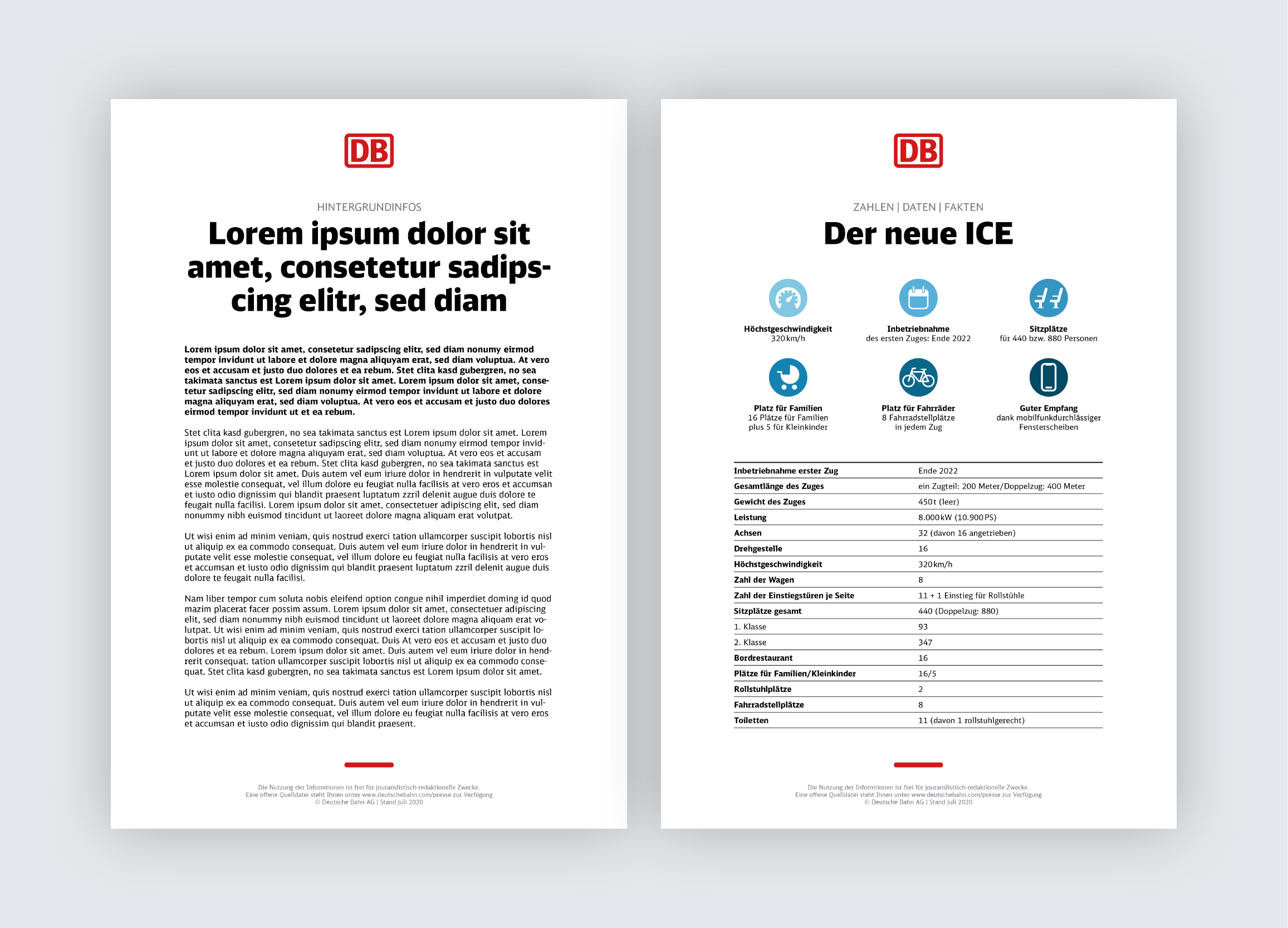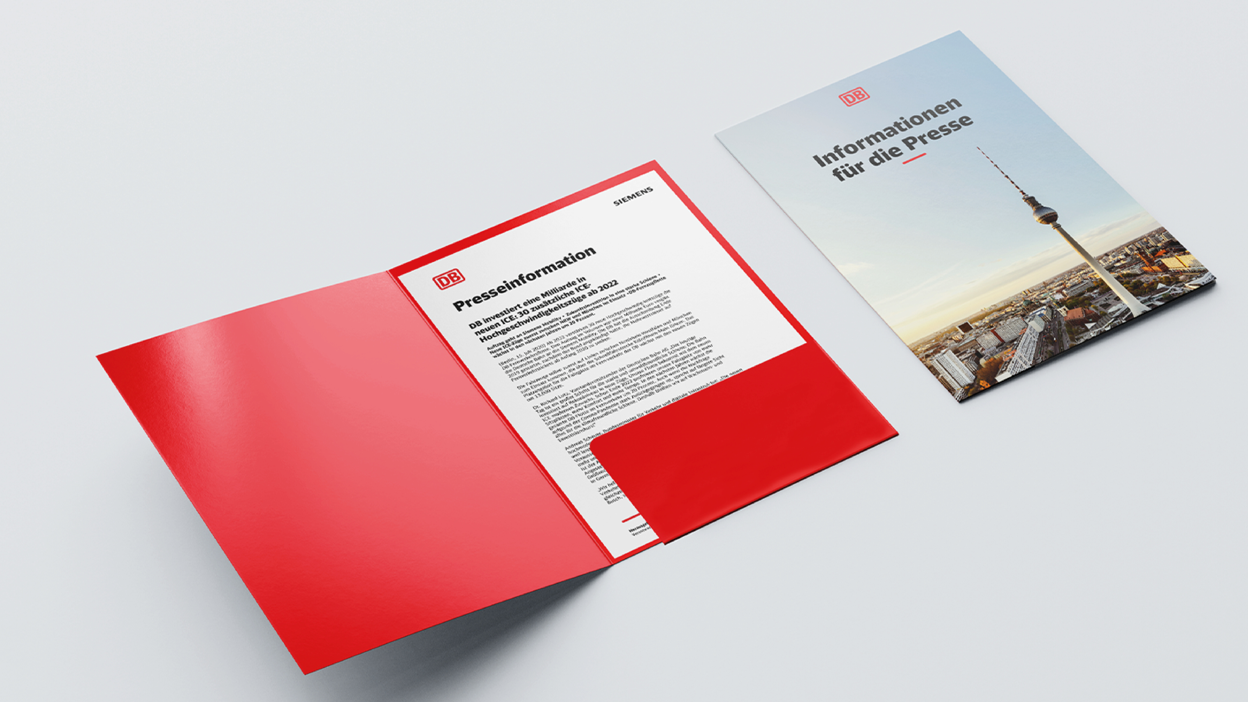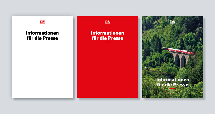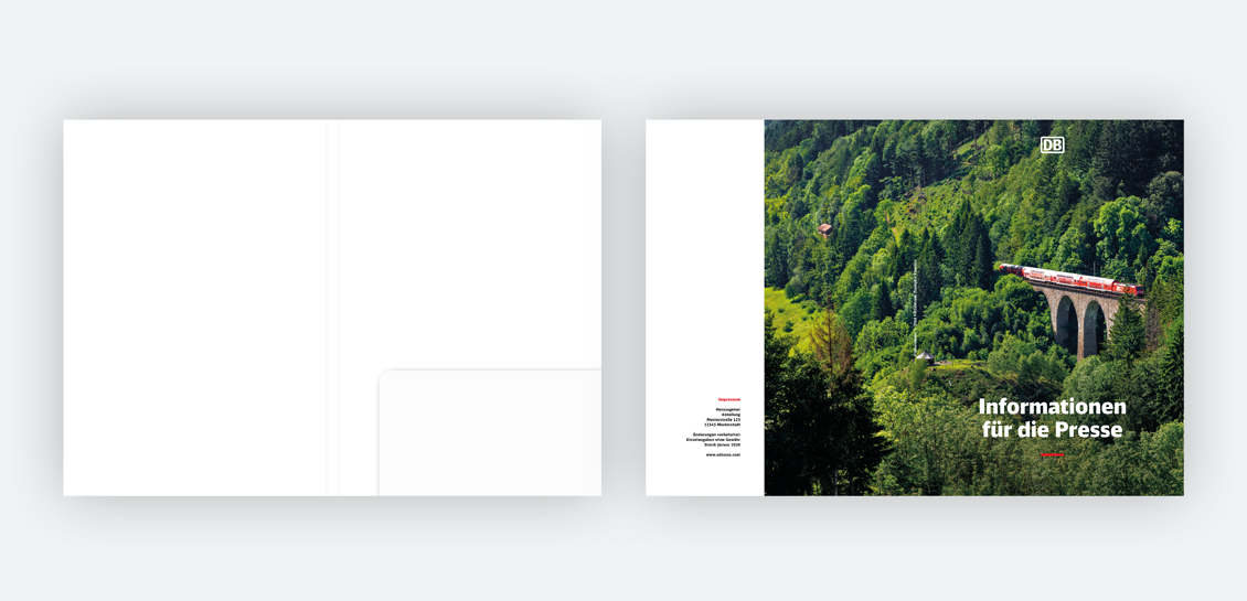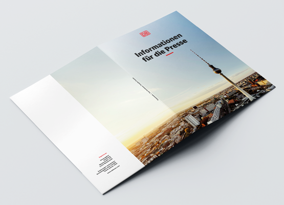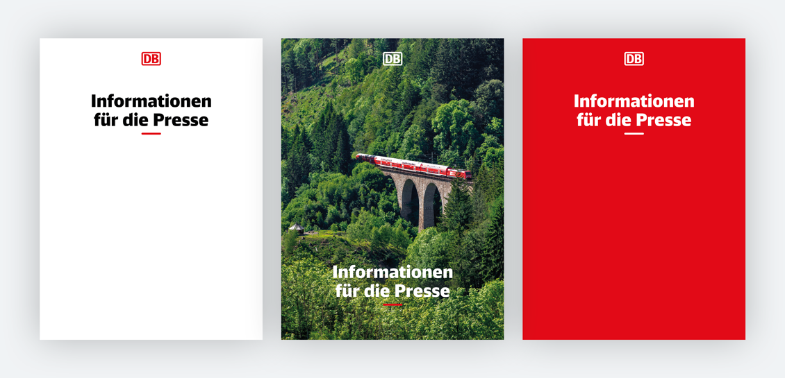 Unsere Pressemappen gibt es in unterschiedlichen Ausführungen. Als farbliches Highlight im kräftigen DB Rot oder im klassischen Weiß. Durch unsere starken Brandcodes, sind wir als Marke auf den ersten Blick erkennbar. Pressemappen mit plakativem Bildmotiv, nehmen beispielsweise einen bewussten Bezug auf das Thema Nachhaltigkeit und die von uns zu vermittelnden inhaltlichen Informationen.