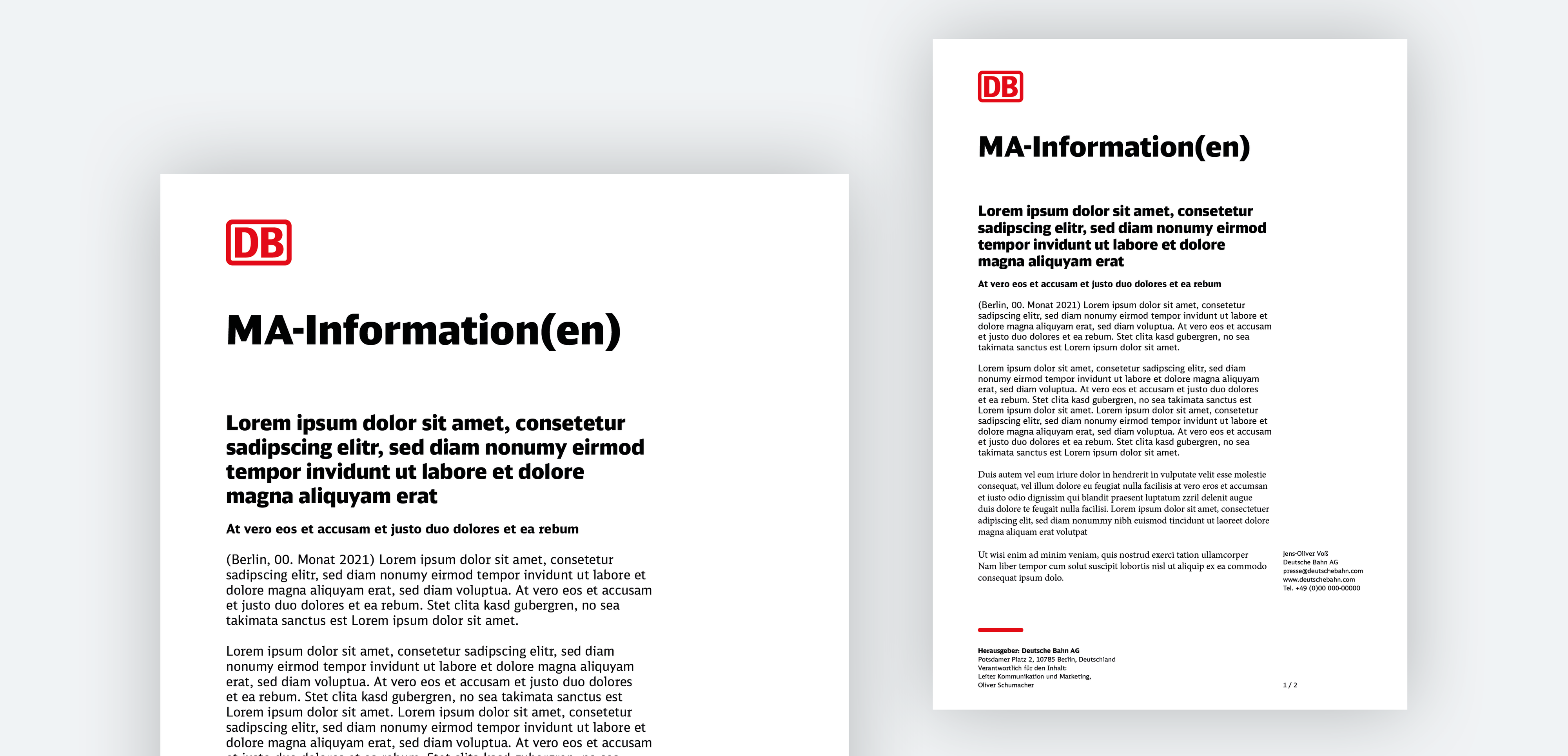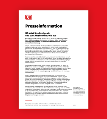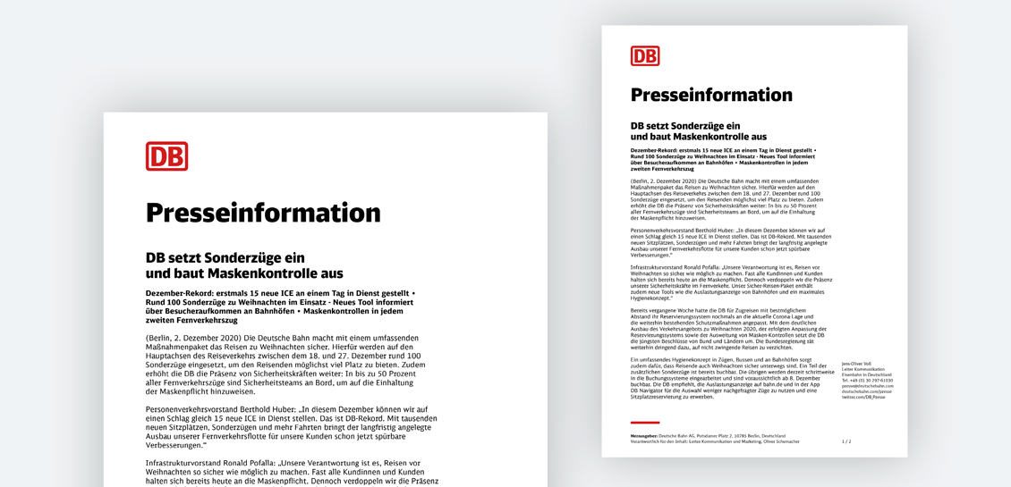Um wichtige Informationen schnell zu erfassen, ist unsere Presseinformation klar gegliedert. Unser Logo und die Inhalte sind linksbündig ausgerichtet. Die DB als Herausgeber wird links unterhalb vom Puls platziert. In der oberen rechten Spalte ist ein optionaler Platz für unsere Partnerlogos vorgesehen. Unsere Kontaktdaten werden in einer Marginalspalte verortet, die zugleich Platz für Notizen bietet. Die Pressemitteilung steht als Template im Download-Bereich zur verfügung.
