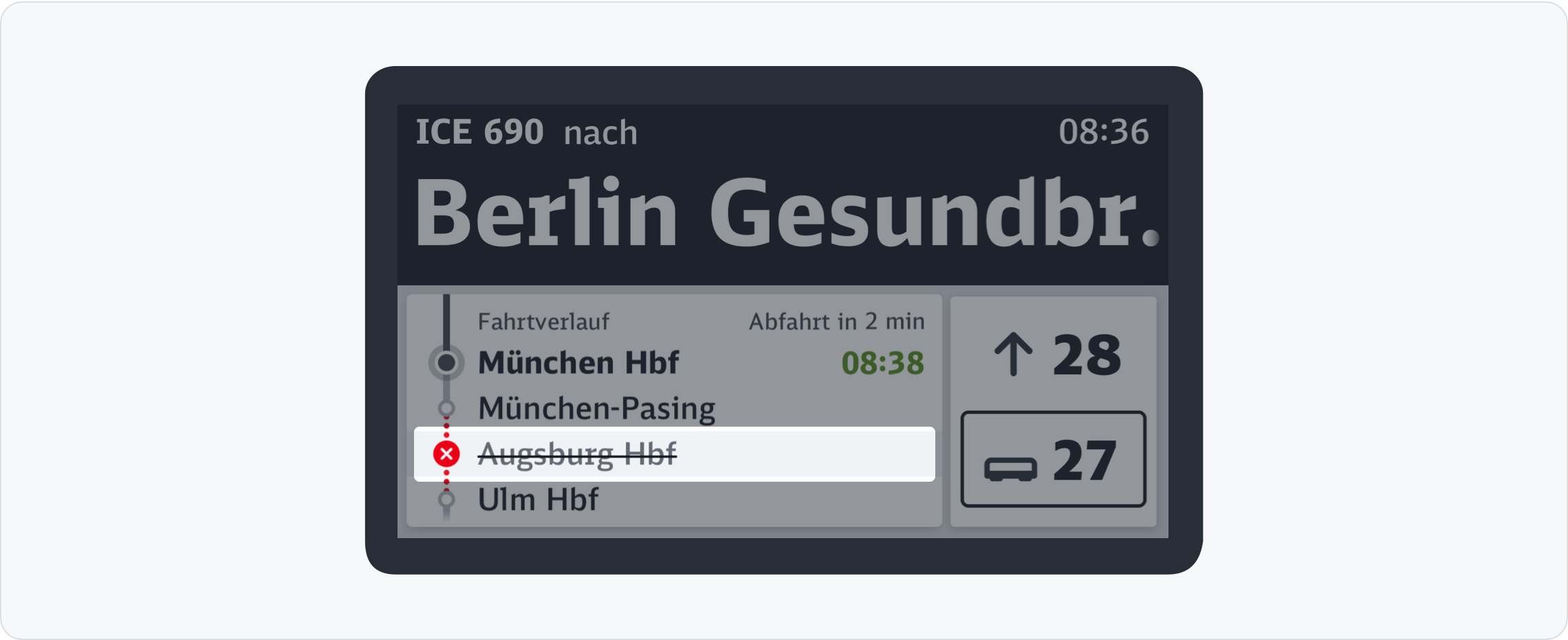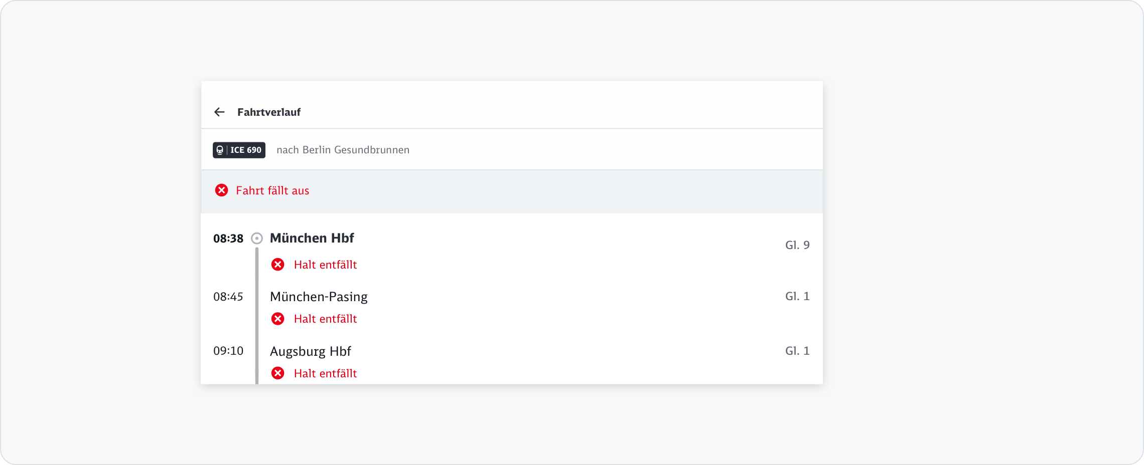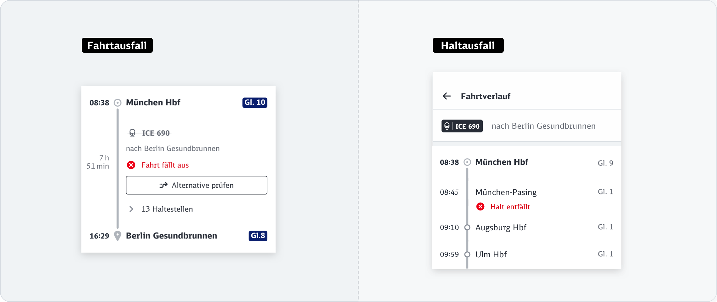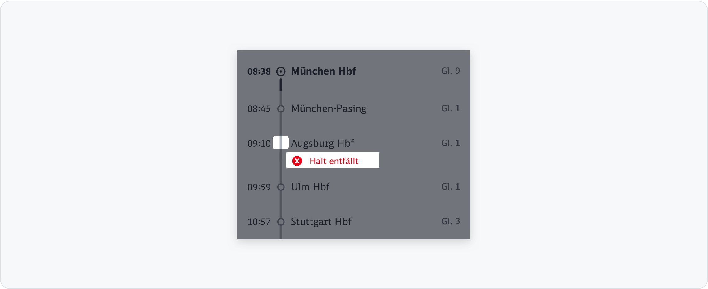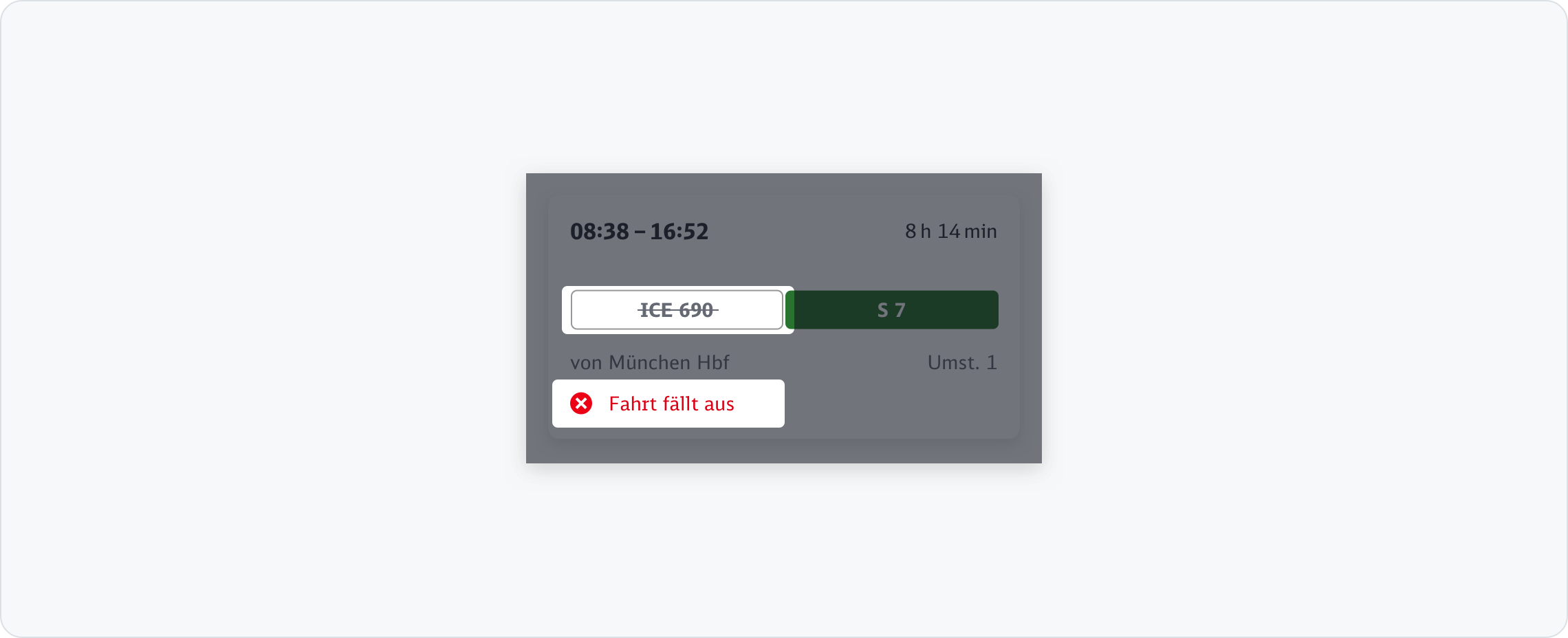 Die Platzierung der Fahrtausfallmeldung variiert je nach Einsatz im Reise- oder Verkehrsmittelverlauf. Einzelne Elemente dieser Standards können in anderen Ausprägungen angewandt werden z.B. in der Verbindungsübersicht oder Zugmonitore.
