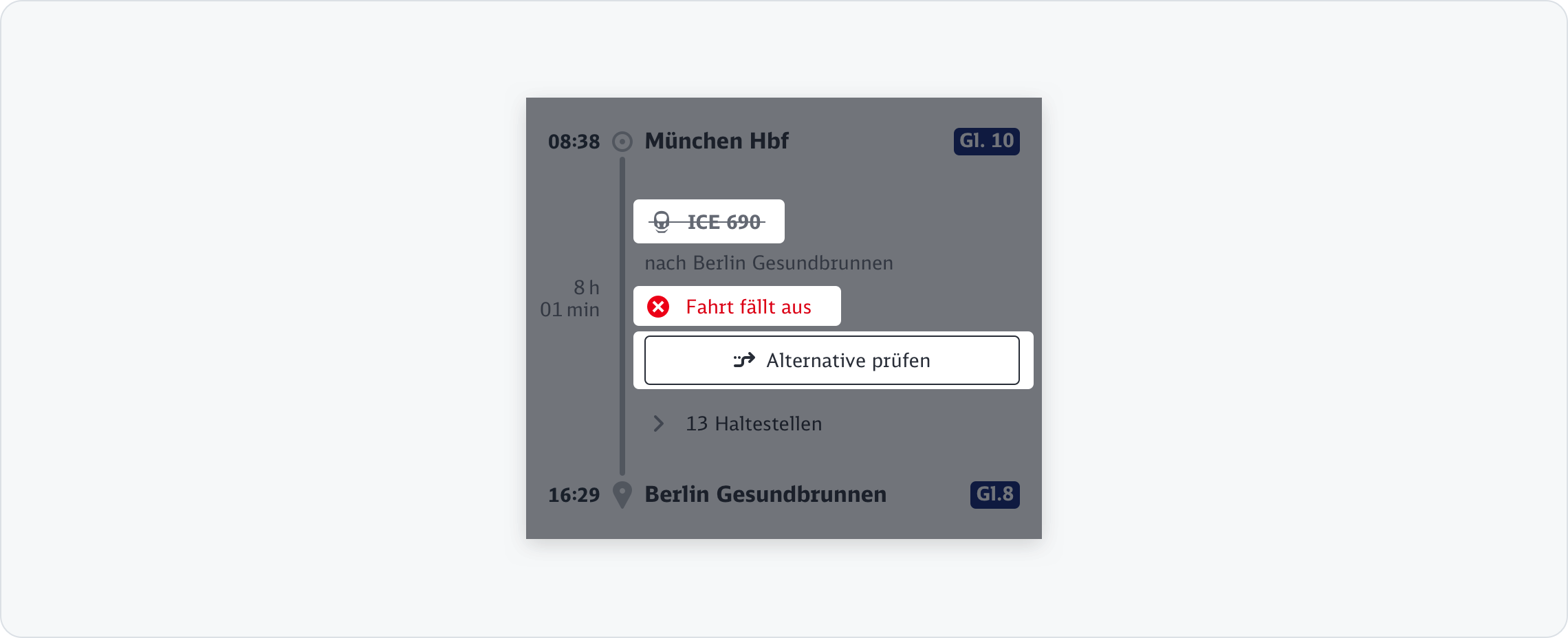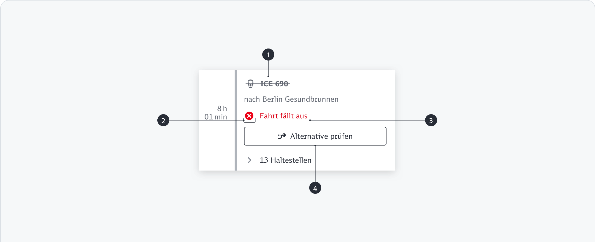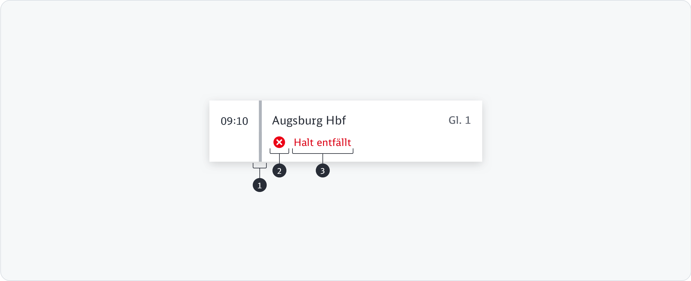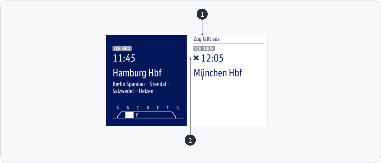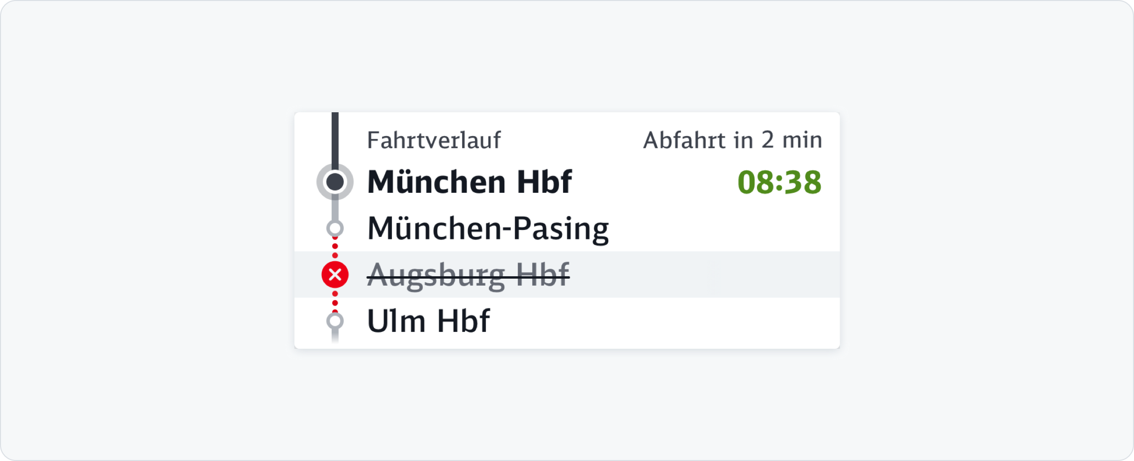 Die Platzierung der Fahrtausfallmeldung variiert je nach Einsatz im Reise- oder Verkehrsmittelverlauf. Einzelne Elemente dieser Standards können in anderen Ausprägungen angewandt werden z.B. in der Verbindungsübersicht oder Zugmonitore.