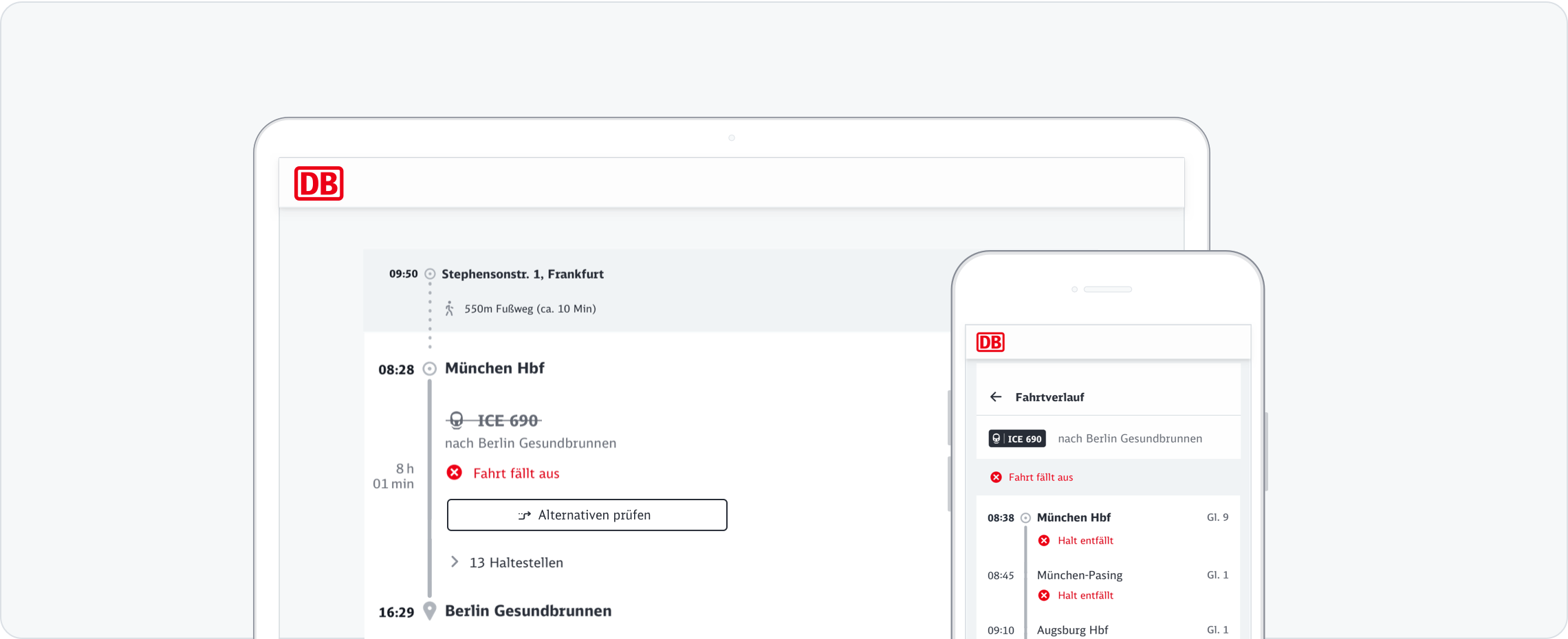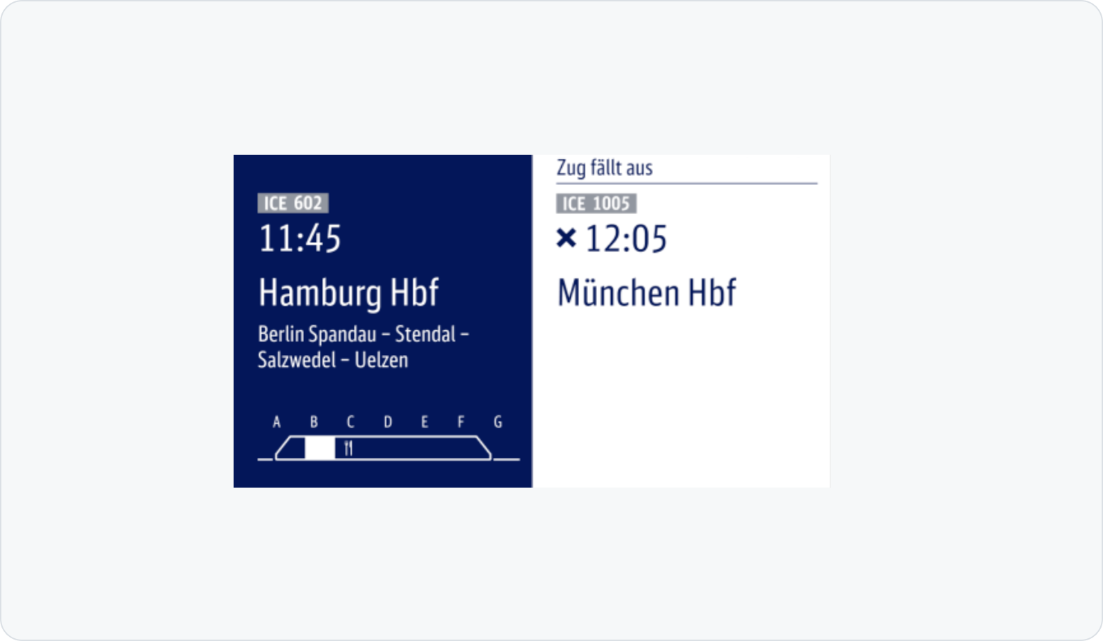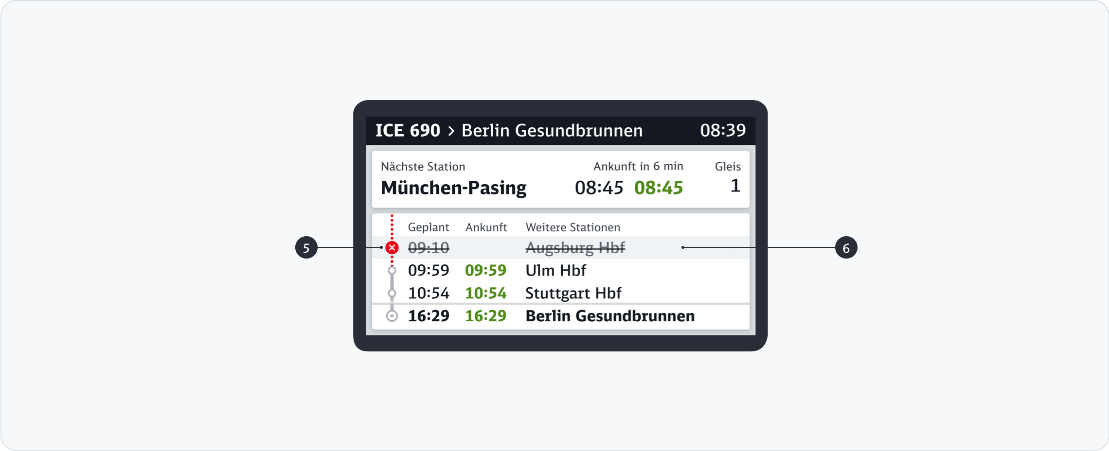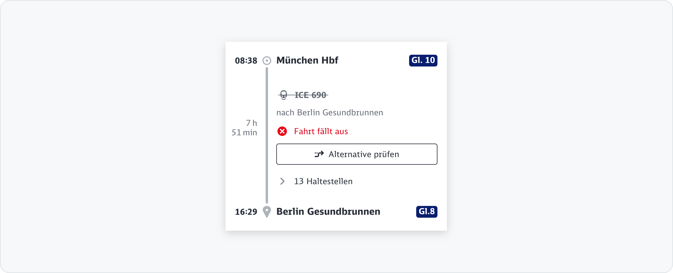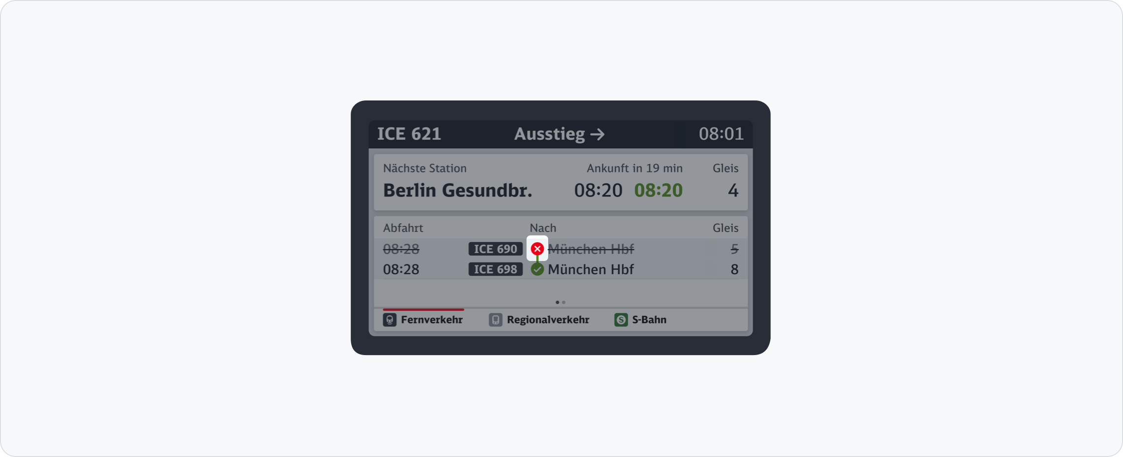 Die Platzierung der Fahrtausfallmeldung variiert je nach Einsatz im Reise- oder Verkehrsmittelverlauf. Einzelne Elemente dieser Standards können in anderen Ausprägungen angewandt werden z.B. in der Verbindungsübersicht oder Zugmonitore.