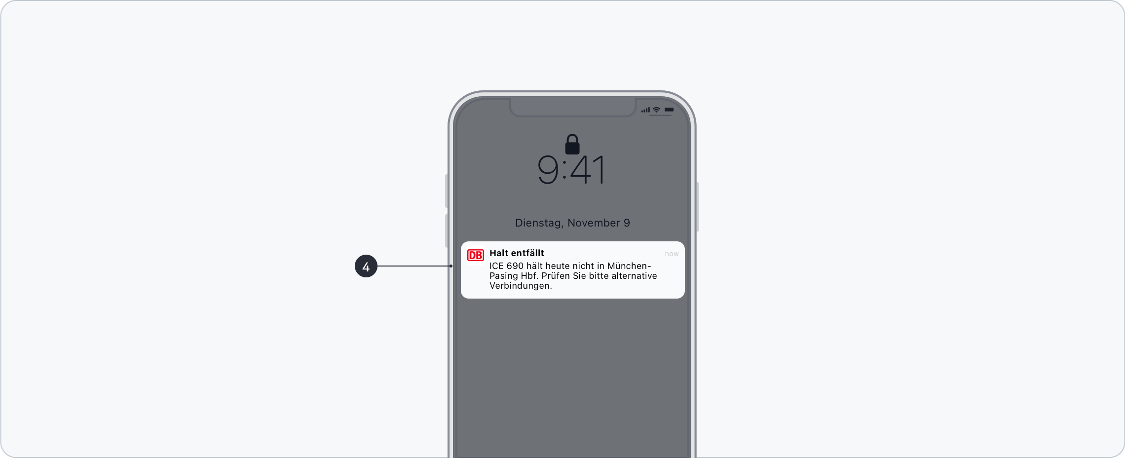 4- PUSH-Meldung innerhalb der Reisebegleitung enthält folgende Informationen: - Meldungsüberschrift: „Halt entfällt“. - Meldungstext: enthält die Informationen über das Verkehrsmittel, den entfallenen Ein- und Ausstiegshalt sowie den Hinweis eine alternative Verbindung zu suchen.