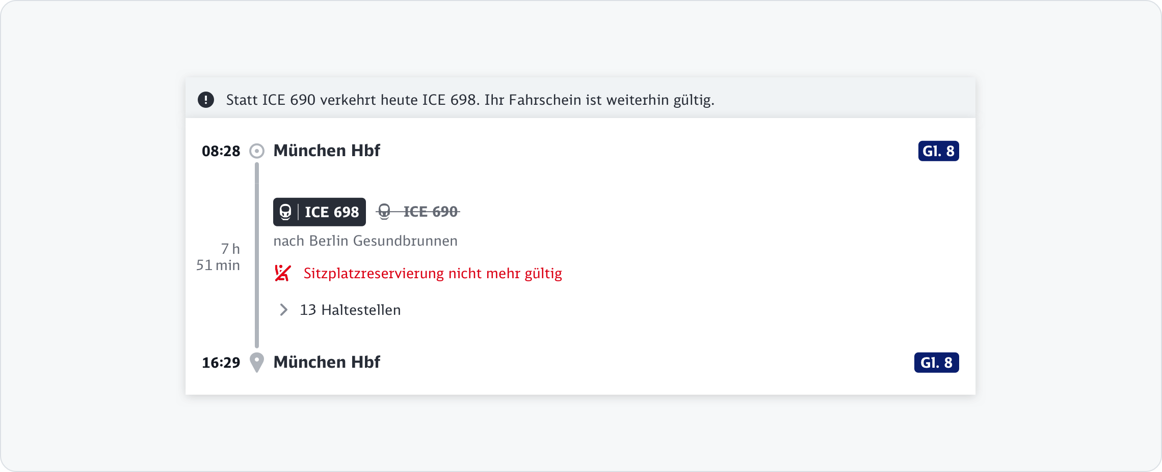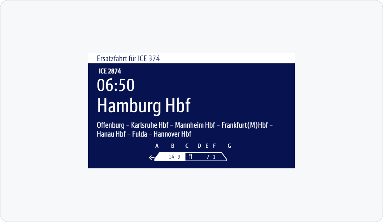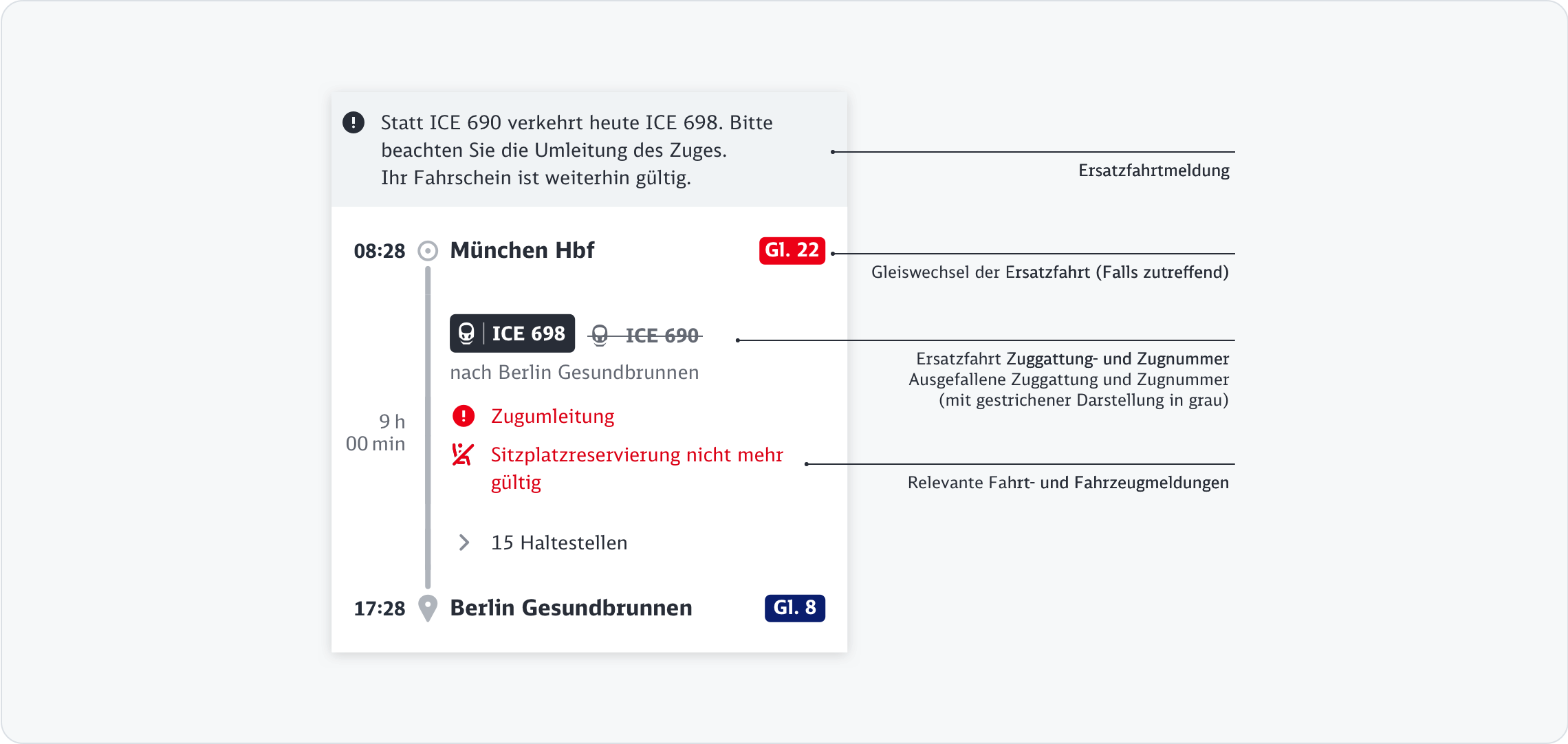 Führendes Design-Prinzip für alle Kanäle: Kommuniziere die Lösung vor dem Problem. Im Fall einer Ersatzfahrt bezieht sich die Lösung auf die neue Zugnummer und das Problem auf den ausgefallenen Zug.