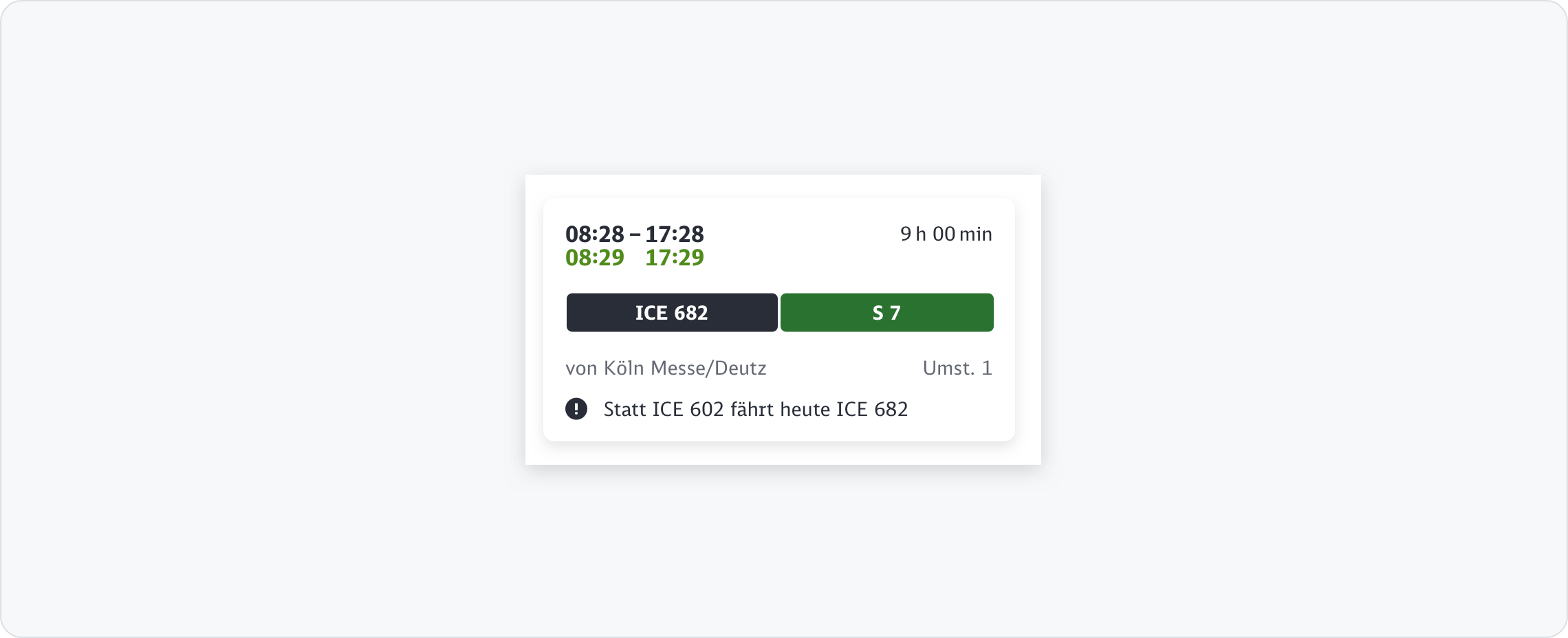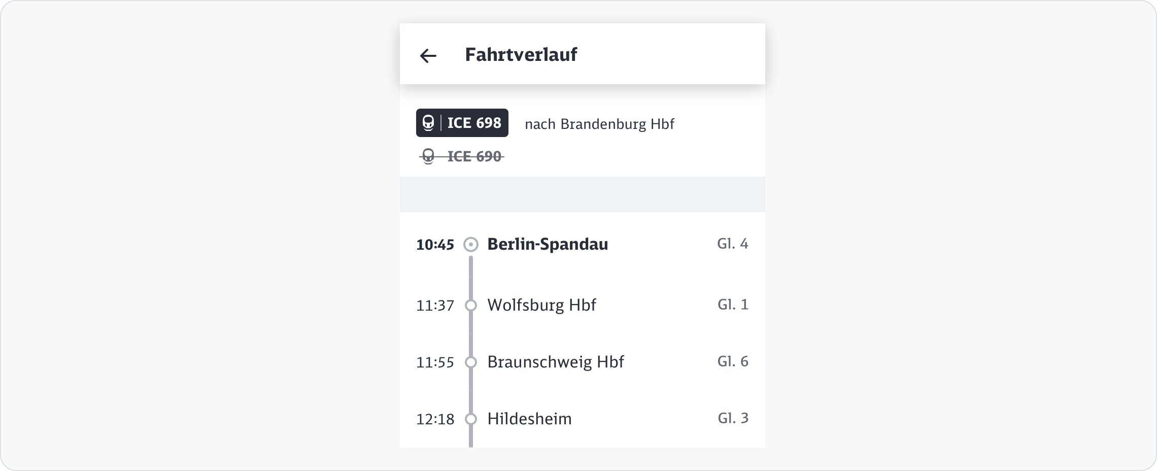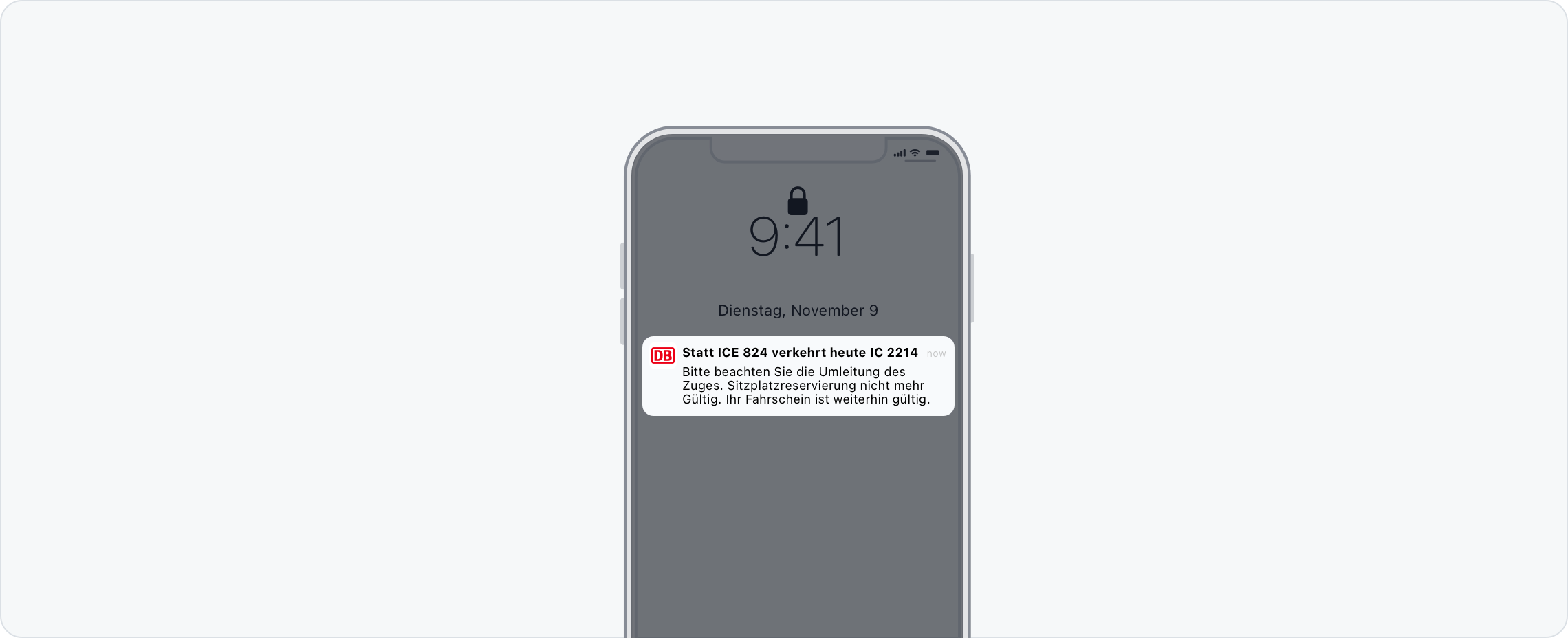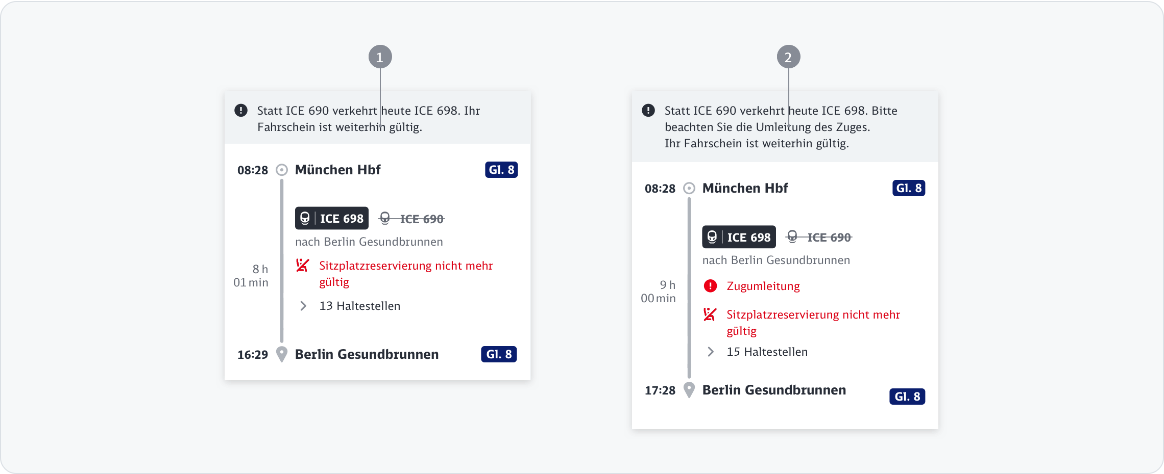 Führendes Design-Prinzip für alle Kanäle: Kommuniziere die Lösung vor dem Problem. Im Fall einer Ersatzfahrt bezieht sich die Lösung auf die neue Zugnummer und das Problem auf den ausgefallenen Zug.