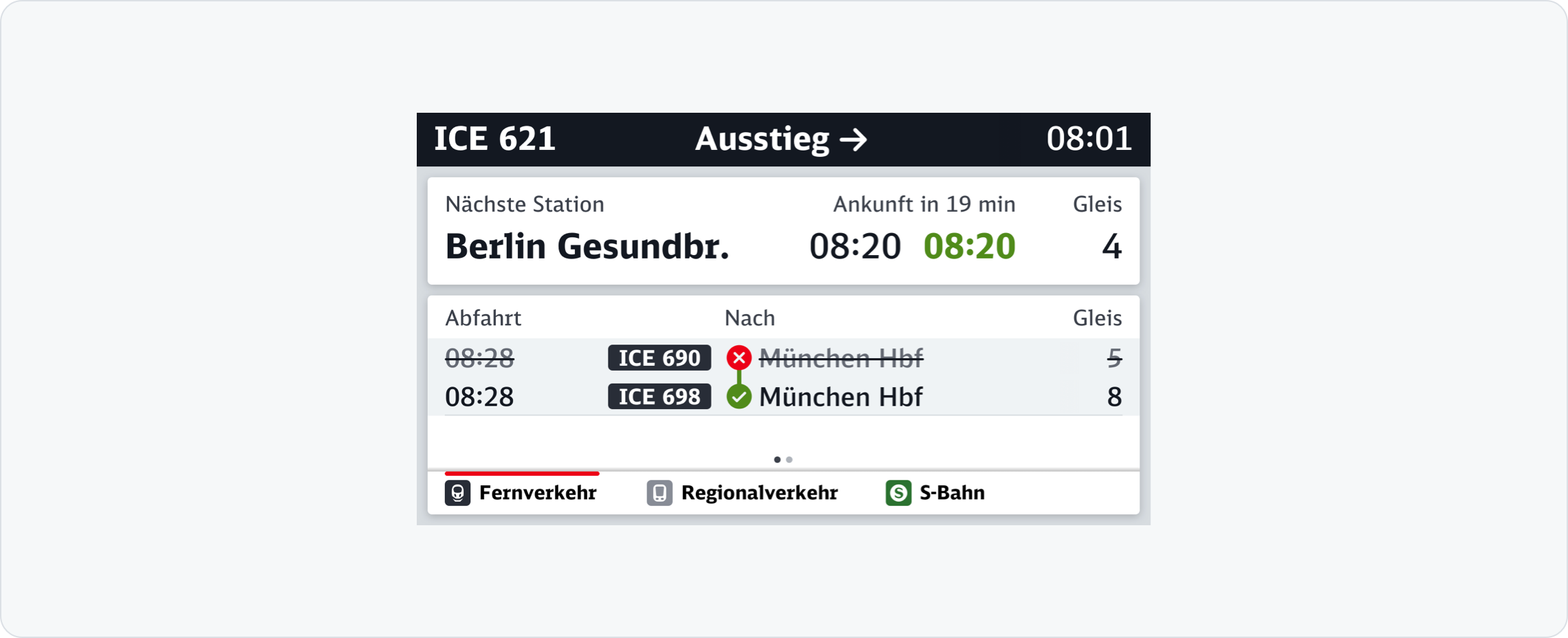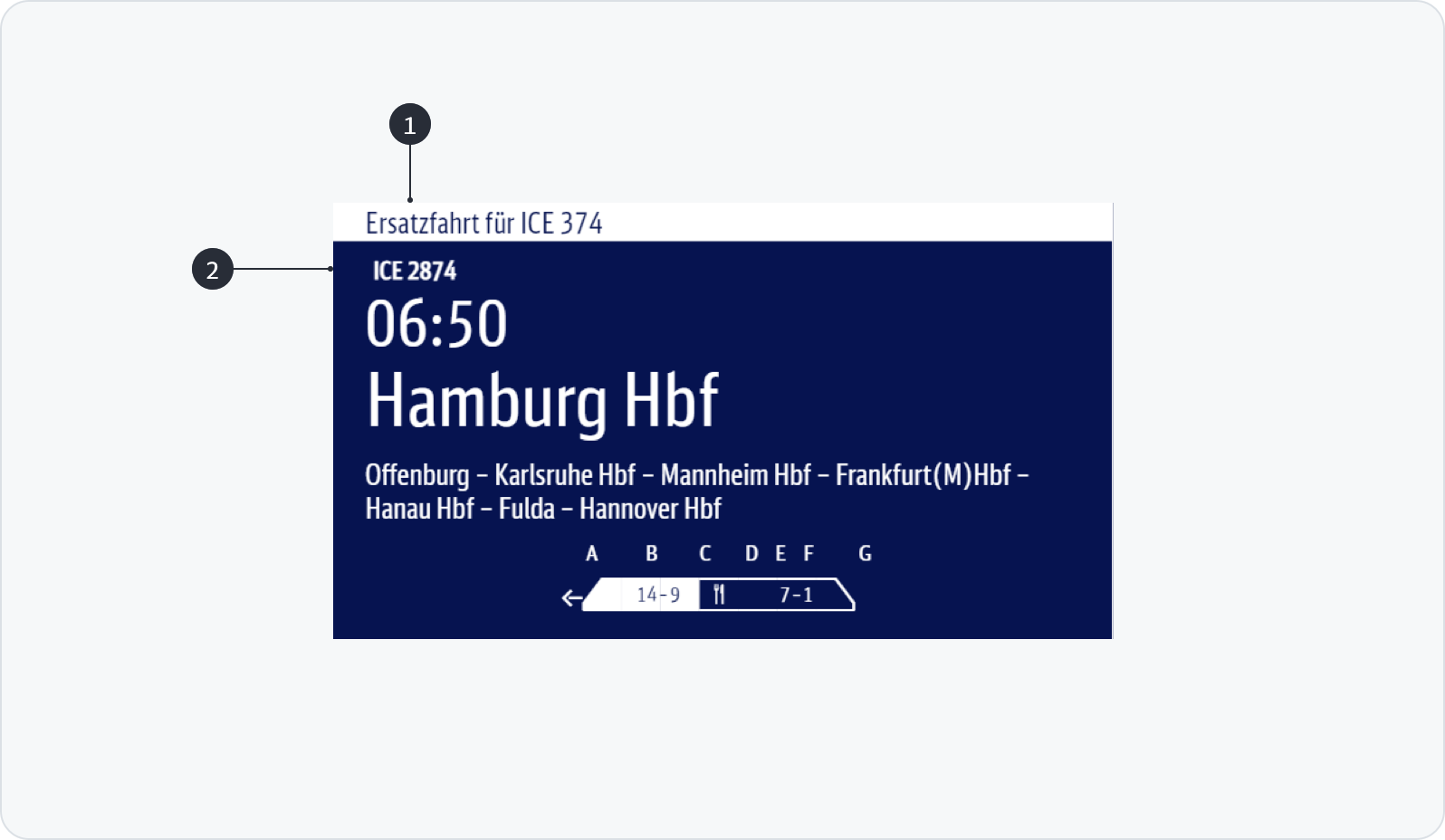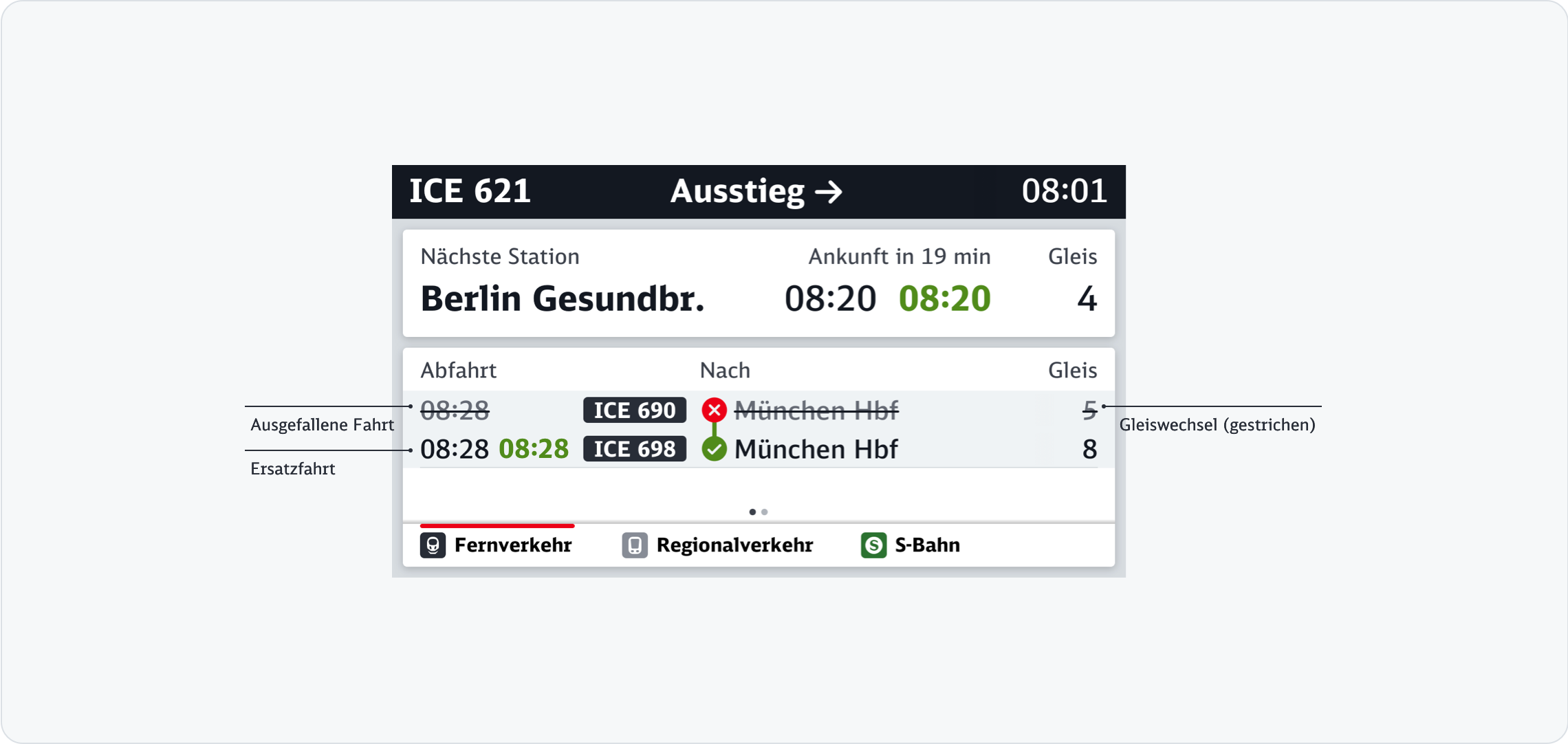 - Ersatzfahrtmeldung: diese besteht aus der ursprünglichen Zuggattung und Zugnummer, neuer Zuggattung und Zugnummer sowie einem Hinweis auf Fahrt- und Fahrzeugmeldungen. Falls zutreffend: der Hinweis zur aufgehobenen Zugbindung des Tickets mit dem Text „Ihr Fahrschein ist weiterhin gültig“.
