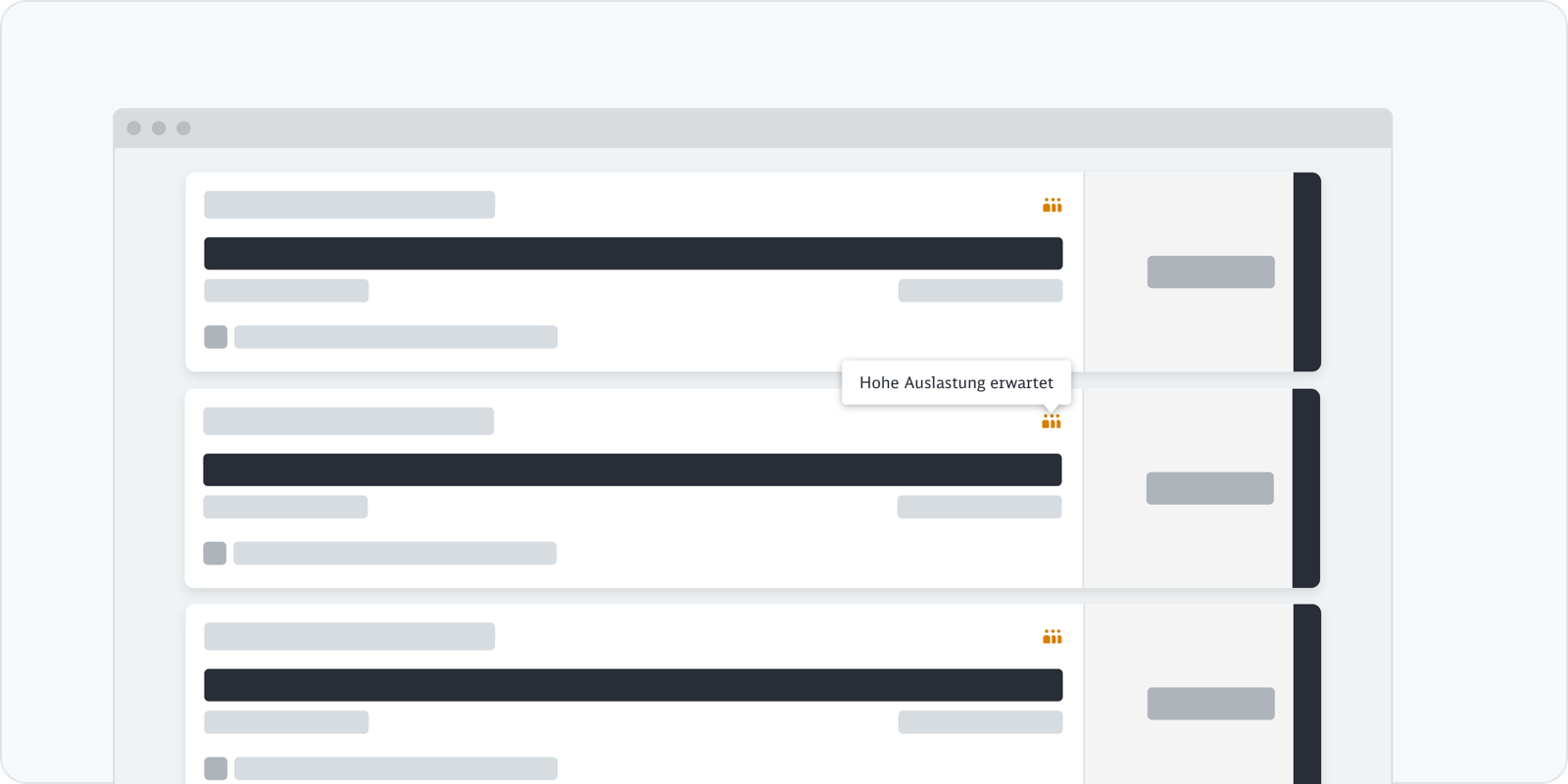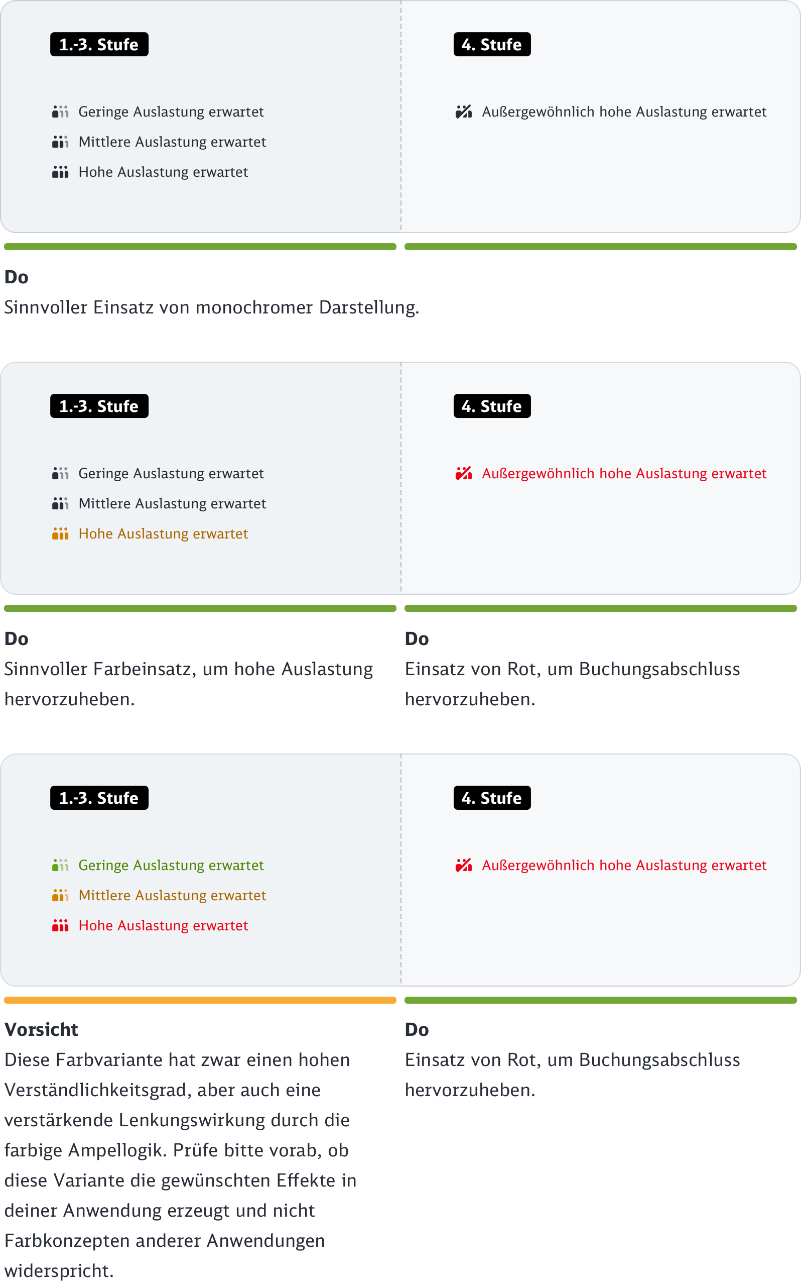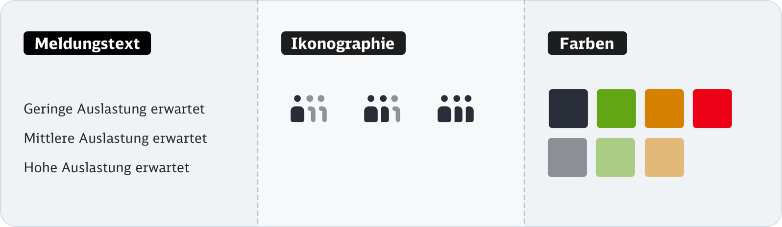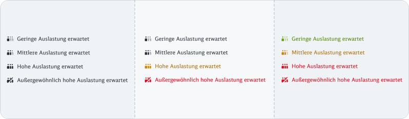 Eine monochrome Darstellung von Auslastungsinformationen mit Icon und Text sorgt für eine Basisverständlichkeit. Die Auslastungsstufen werden erkannt und unterschieden. Eine sukzessive Farbabstufung können wir als dritten Baustein einsetzen, um Auslastungsinformationen darzustellen.