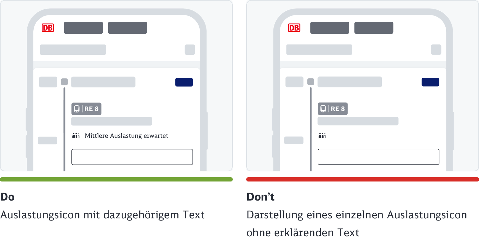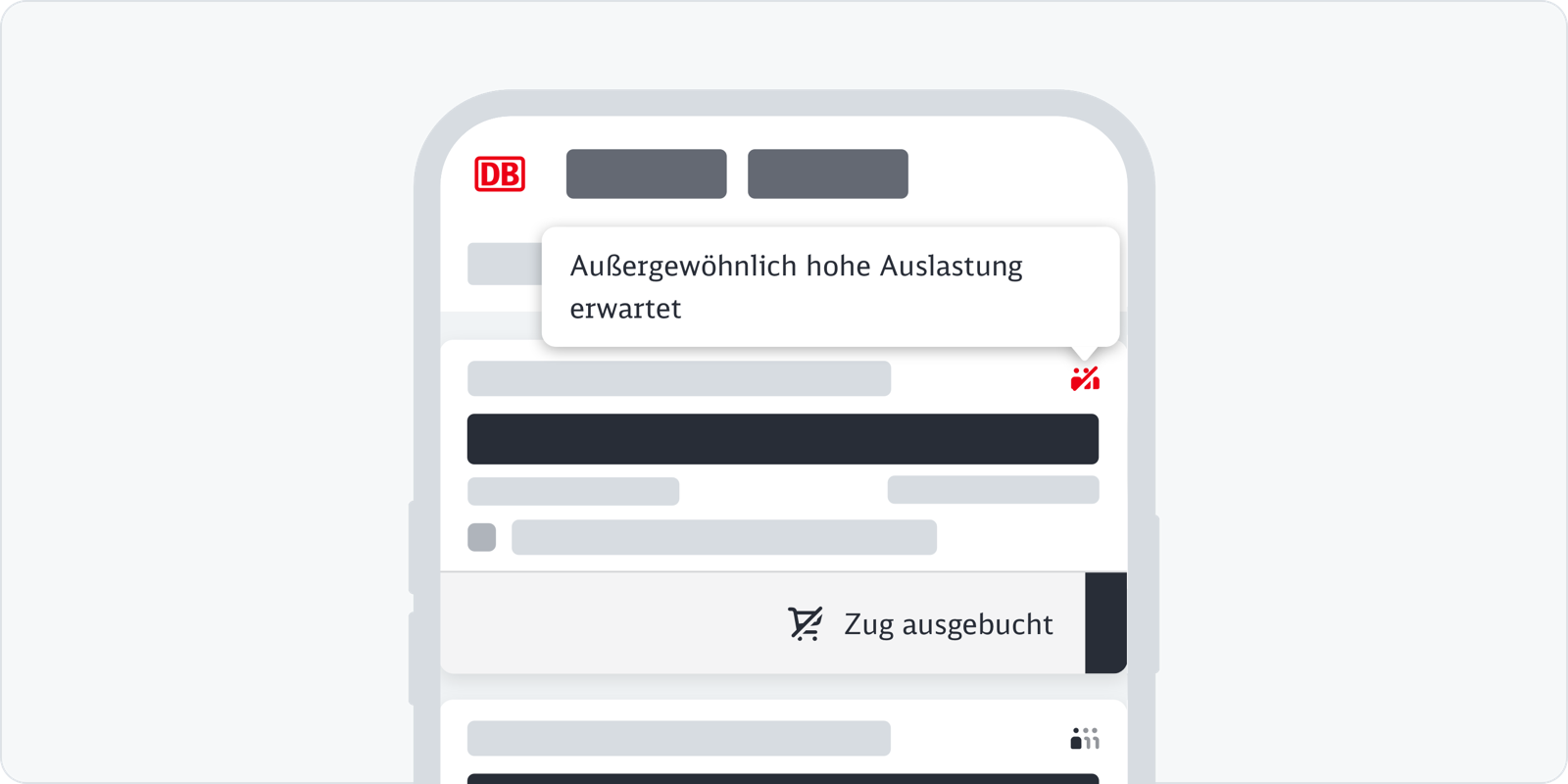 Wir verwenden aktuell die Auslastung in Web- und mobilen Anwendungen. In diesem Kontext kann die Auslastung in der Verbindungsübersicht, im Reiseverlauf, in der Wagenreihung und im Fahrtverlauf dargestellt werden.