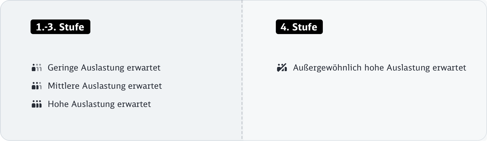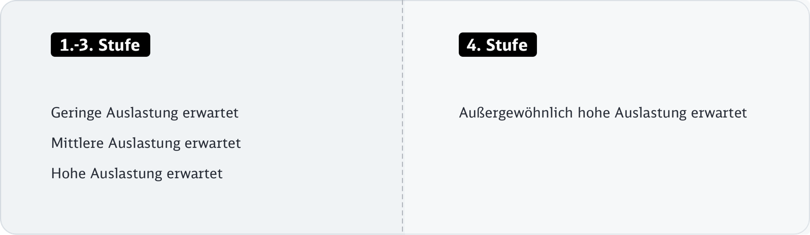 Die erste Stufe bezeichnen wir mit Geringe Auslastung erwartet. Mittlere Auslastung erwartet nennen wir die zweite Stufe. Bei der dritten Stufe sprechen wir von Hohe Auslastung erwartet.