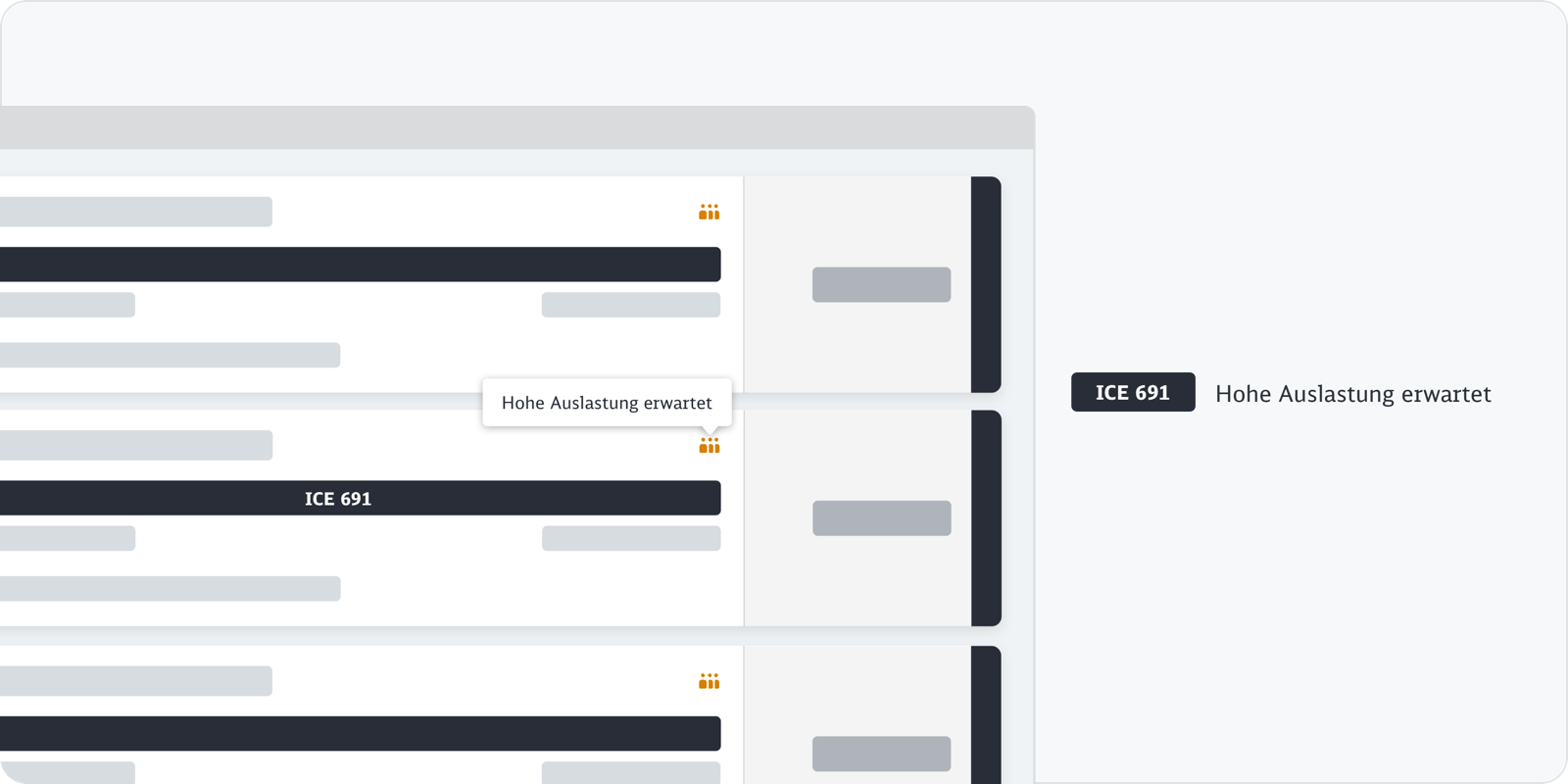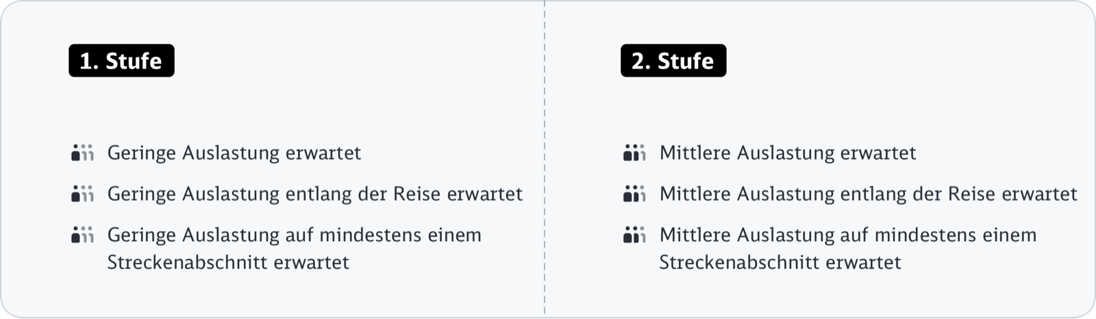 Für unsere komfortbewussten Reisenden zeigen wir im gesamten Reiseverlauf für jeden Zwischenhalt die Auslastungsinformation an. . So können sie sich während der Fahrt auf dem Laufenden halten, wo sich auf geringere oder höhere Auslastung einzustellen ist.