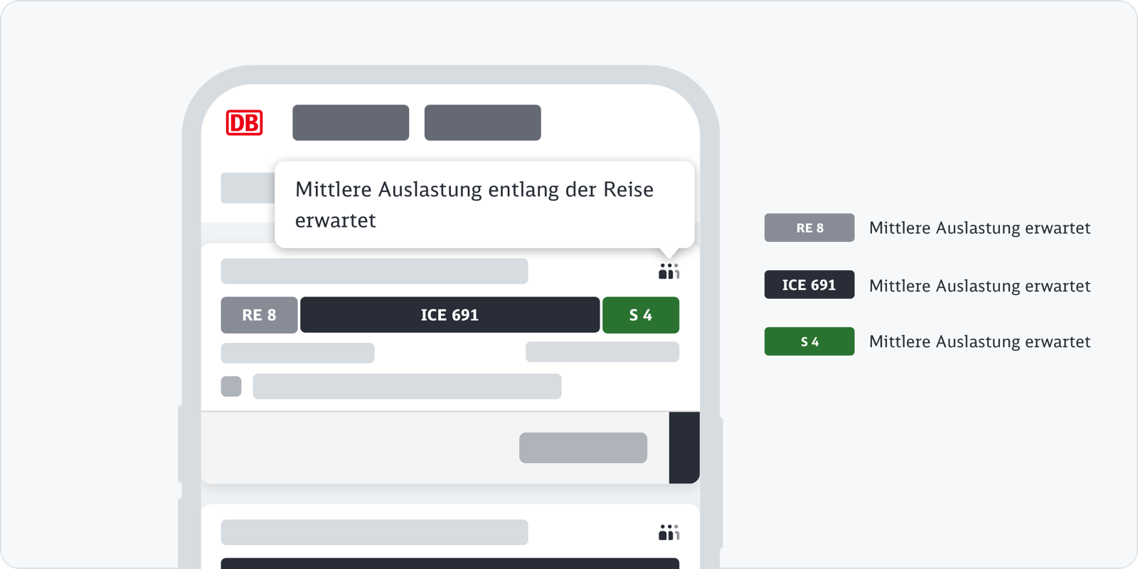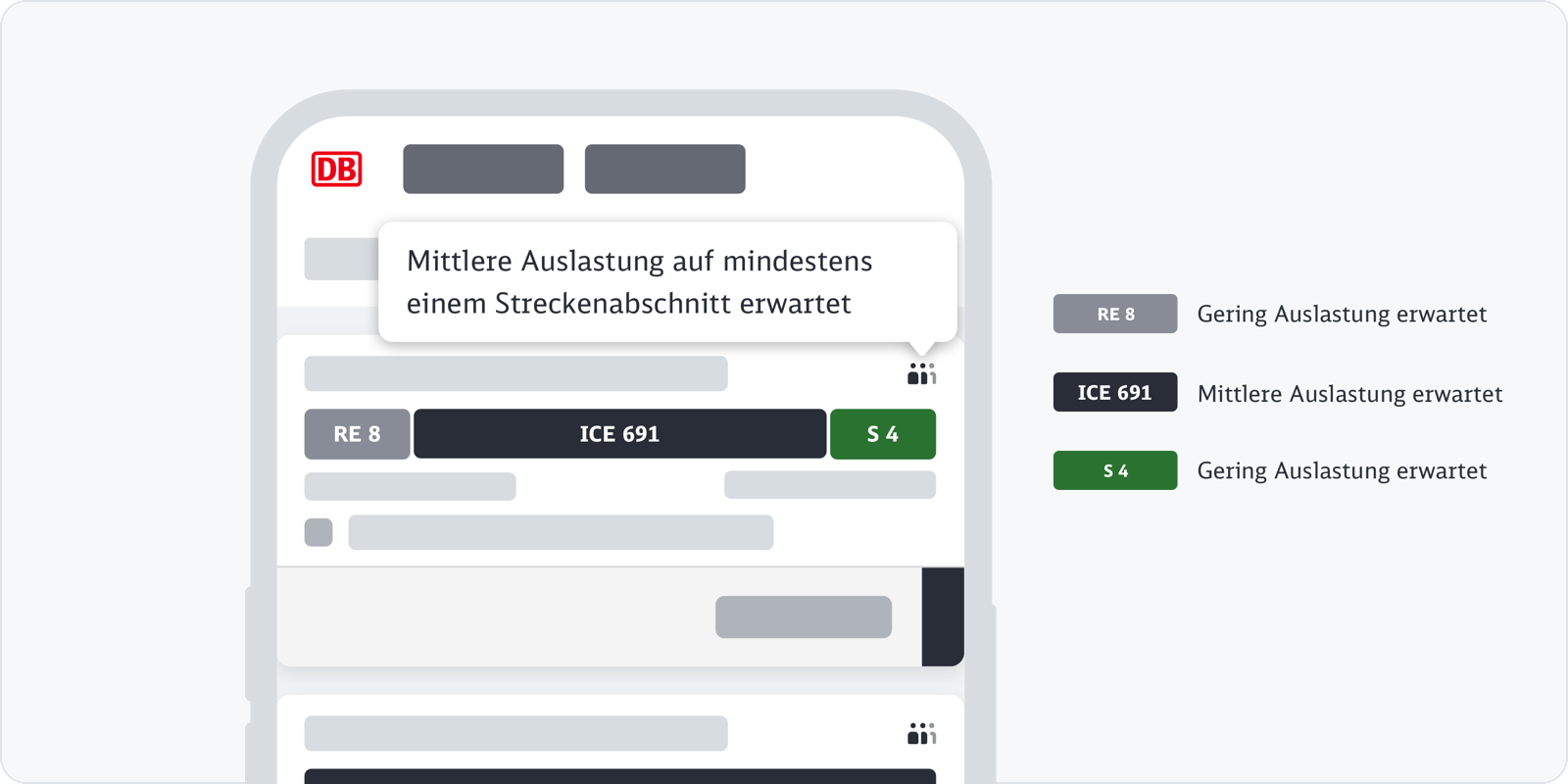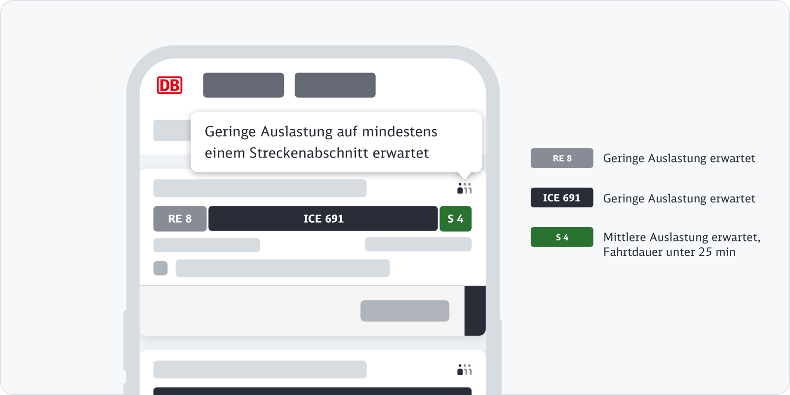 In unseren Web- oder App-Kanälen stellen wir die verschiedenen Reisemöglichkeiten in der Verbindungsübersicht dar. Über die Verbindungskachel stellen wir eine Reise dar. Eine Verbindung kann aus einer Fahrt bestehen oder sich aus mehreren Teilstrecken zusammensetzen. Wir geben bereits in der Verbindungsübersicht die Auslastungsinformation für Fernverkehr und Regionalverkehr an.