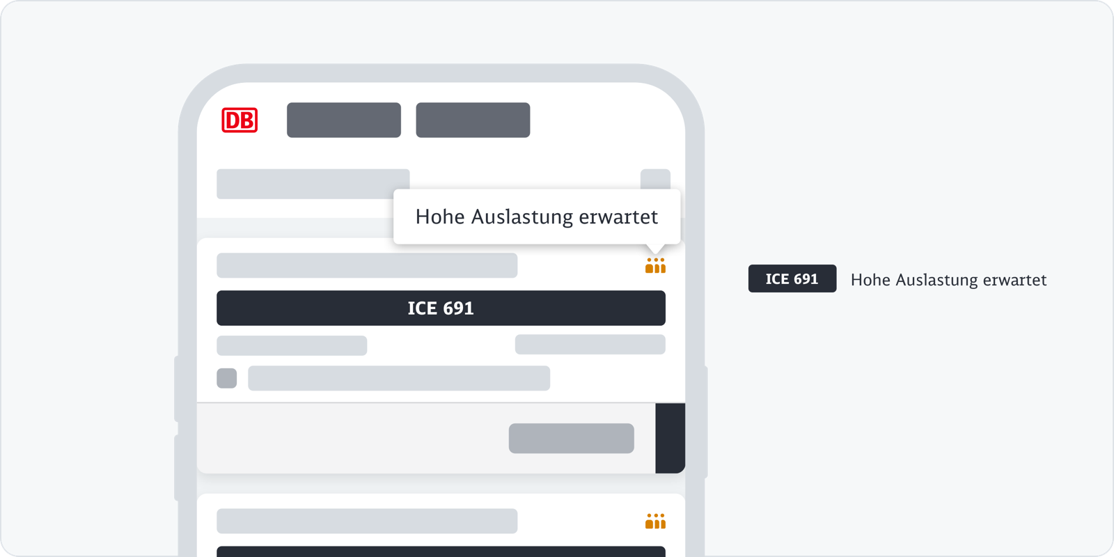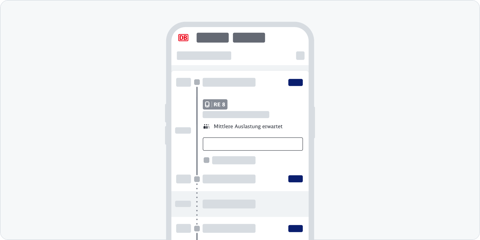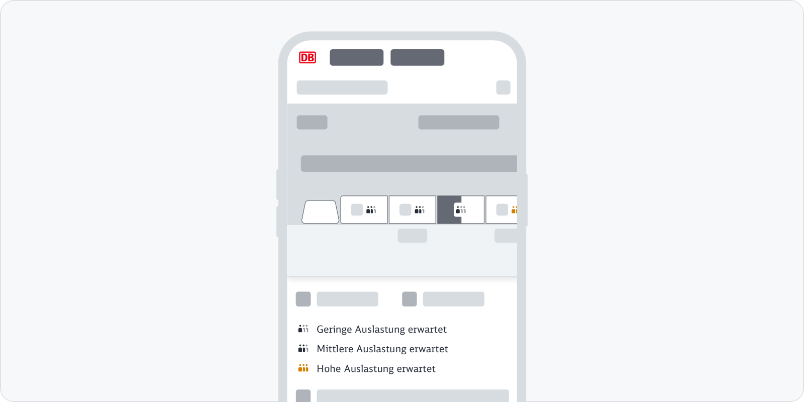 In unseren Web- oder App-Kanälen stellen wir die verschiedenen Reisemöglichkeiten in der Verbindungsübersicht dar. Über die Verbindungskachel stellen wir eine Reise dar. Eine Verbindung kann aus einer Fahrt bestehen oder sich aus mehreren Teilstrecken zusammensetzen. Wir geben bereits in der Verbindungsübersicht die Auslastungsinformation für Fernverkehr und Regionalverkehr an.