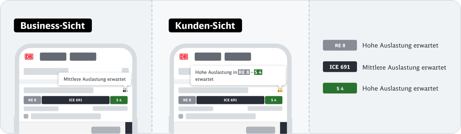 Um bestmögliche Verständlichkeit und Akzeptanz der Darstellung von Auslastungsinformationen bei kombinierten Fahrten (Fernverkehrs- & Nahverkehrsanteil) zu erreichen, wurden qualitative und quantitative Befragungen durchgeführt. Der Bericht ist im Analyseportal verfügbar. Die unten abgebildete Logik haben wir aus den Research-Ergebnissen abgeleitet.