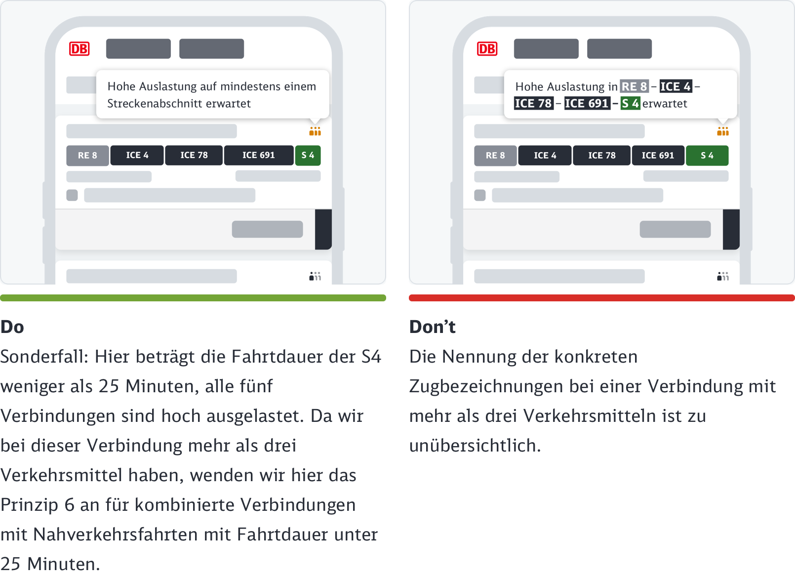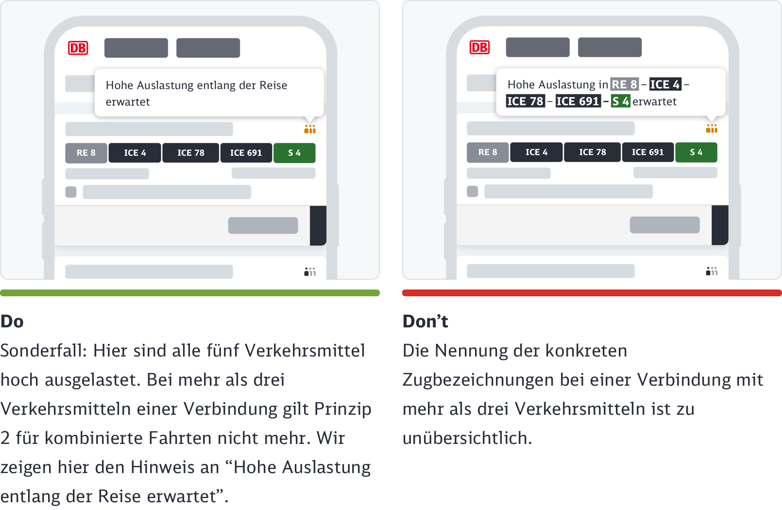 Als führendes Design-Prinzip für alle Kanäle gilt, dass die ikonographische Darstellung durch den dazugehörigen Text der Auslastungsstufe erklärt wird.