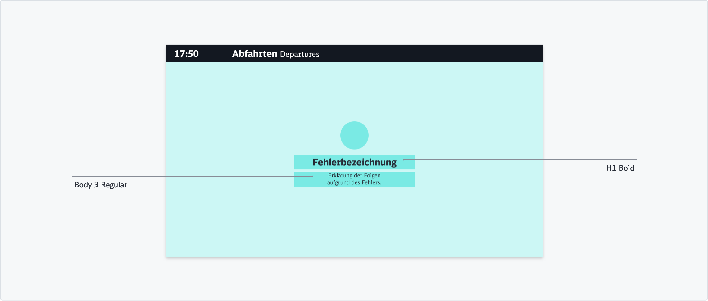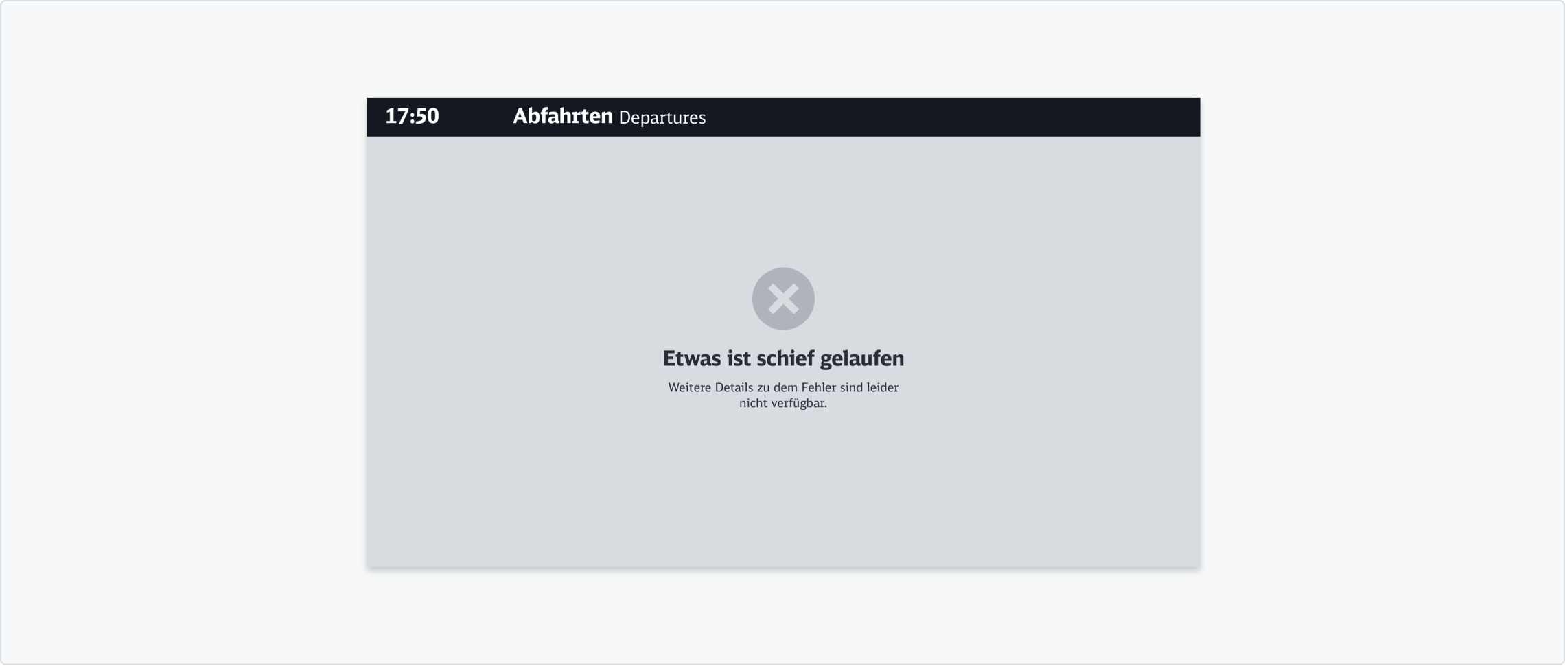 Fehlerfälle können aufgrund unterschiedlicher Faktoren entstehen. Diese sind anschließend detailliert aufgelistet. Schematisch baut sich ein Fehlerfall durch das Icon “Kritisch” und einer textuellen Informationen auf. Die Headline bleibt in einer reduzierten Weise mit Uhrzeit und Abfahrt weiterhin bestehen.