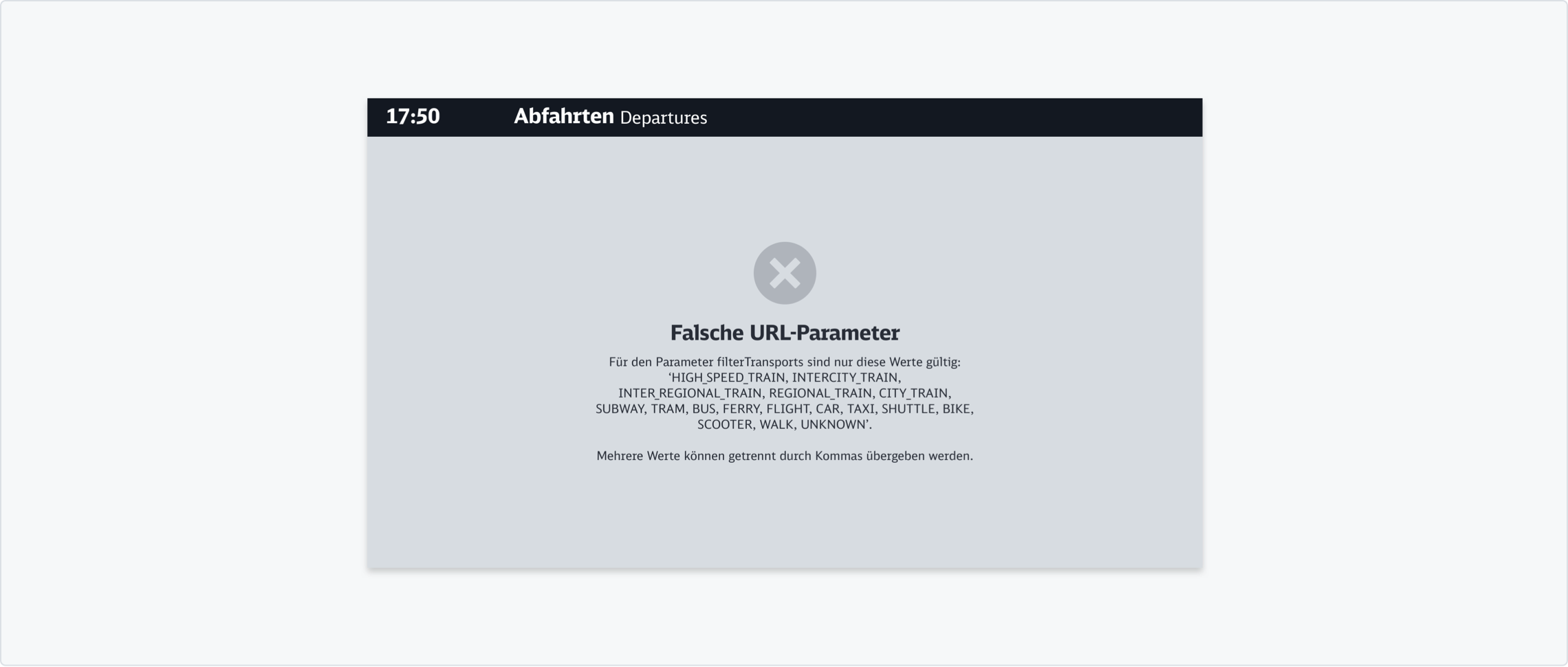 Für den Parameter filterTransports sind nur diese Werte gültig: ‘HIGH_SPEED_TRAIN, INTERCITY_TRAIN, INTER_REGIONAL_TRAIN, REGIONAL_TRAIN, CITY_TRAIN, SUBWAY, TRAM, BUS, FERRY, FLIGHT, CAR, TAXI, SHUTTLE, BIKE, SCOOTER, WALK, UNKNOWN’. Mehrere Werte können getrennt durch Kommas übergeben werden.