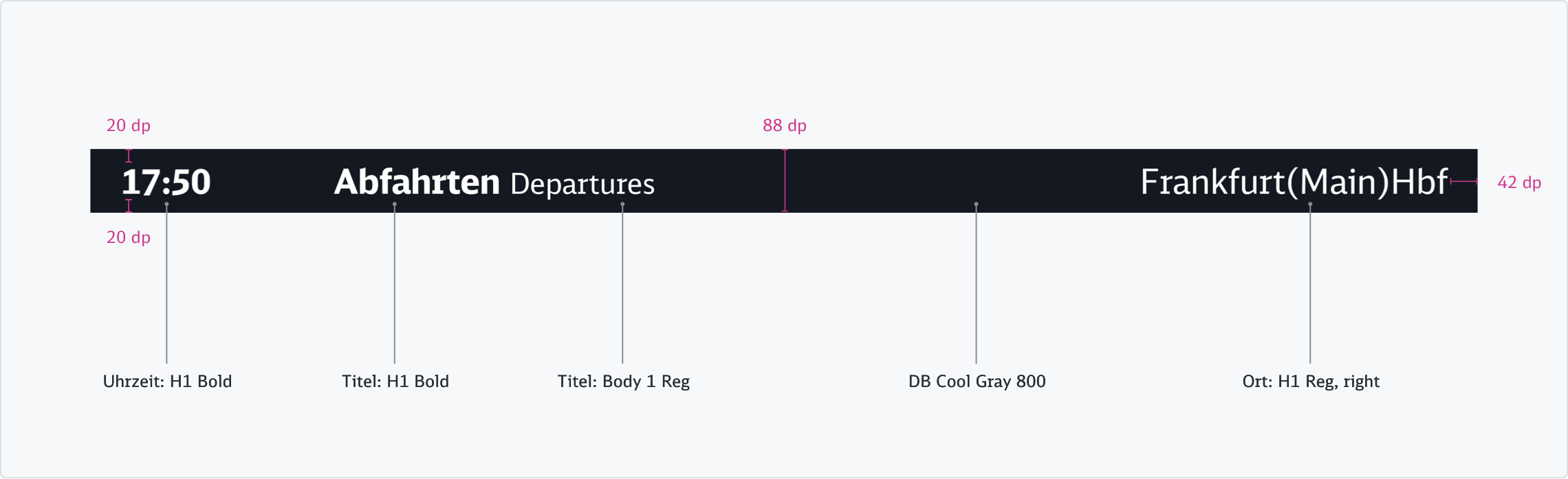Der Header erstreckt sich randabfallend nach links, rechts und der oberen Kante des Layouts. Er untergliedert sich in die Uhrzeit links beginnend, dem Titel mit englischer Übersetzung sowie dem abgefragten Ort. Die Farbcodierung des Headers ist DB Cool Gray 800.