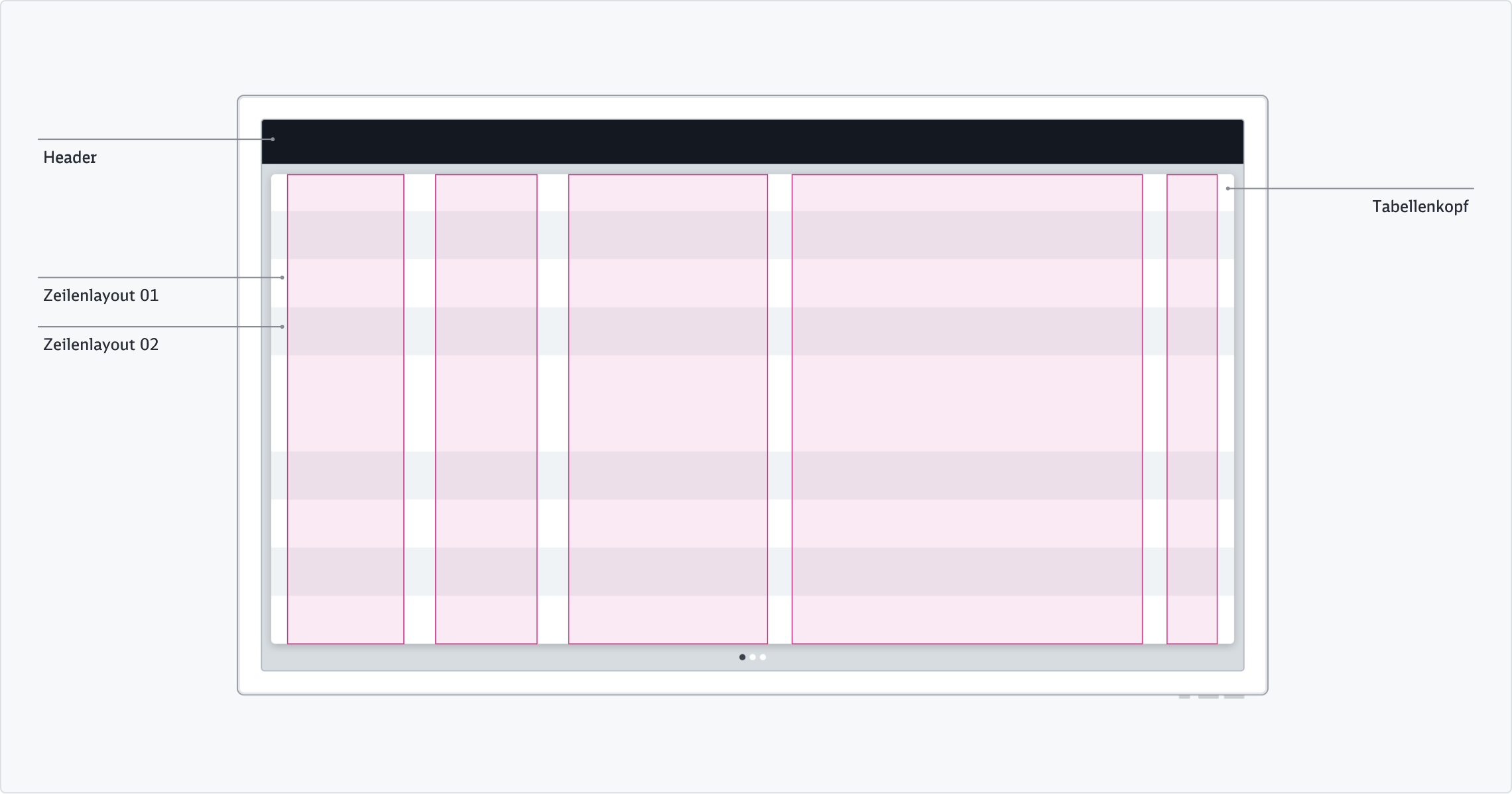 Das Grundgerüst der Abfahrtstafel ist eine tabellarische Darstellung der Zuginformationen. Diese ist in Spalten unterteilt, welche die Parameter definiert, sowie in Zeilen, welche die Informationen aufzeigen. Zur Orientierung, wurden die Zeilen in Farbflächen unterteilt (DB White, DB Cool Gray 100) welche die Lesbarkeit verbessern.
