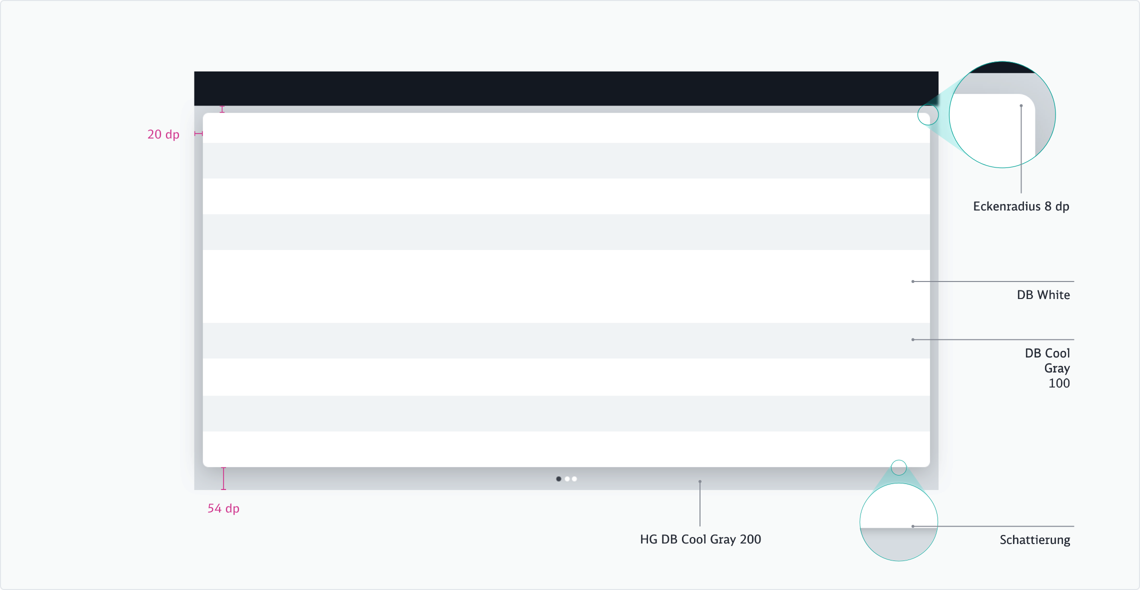 Für die Hintergrundfläche wurde DB Cool Gray 200 verwendet. Diese unterscheidet sich von der visuellen Darstellung der Tabelle und sorgt für ein gutes Kontrastverhältnis. Die Tabelle selbst besitzt einen Schatten, der zusätzlich Tiefe schafft und den Kontrast noch weiter verstärkt. Für die Tabelle werden abgerundete Ecken eingesetzt. Das Zeilenlayout verwendet abwechselnde DB UX Hintergrundfarben, um eine klare Orientierung der Zeilen zu schaffen. Die Abstände zum Header, linken und rechten Seitenende beträgt universell 20 dp. Aufgrund des Paging-Indikators unterhalb der Tabelle, ist dort ein größerer Abstand von 54 dp gesetzt.