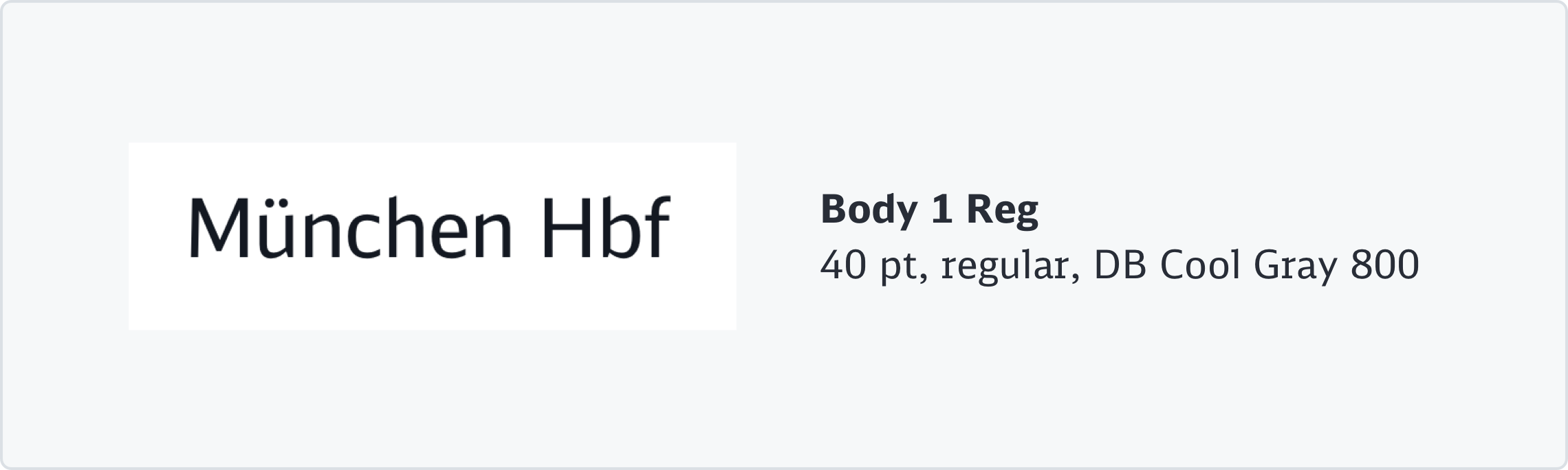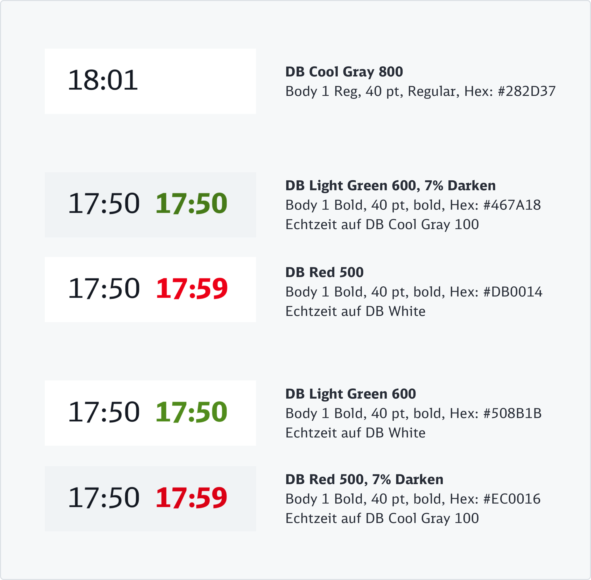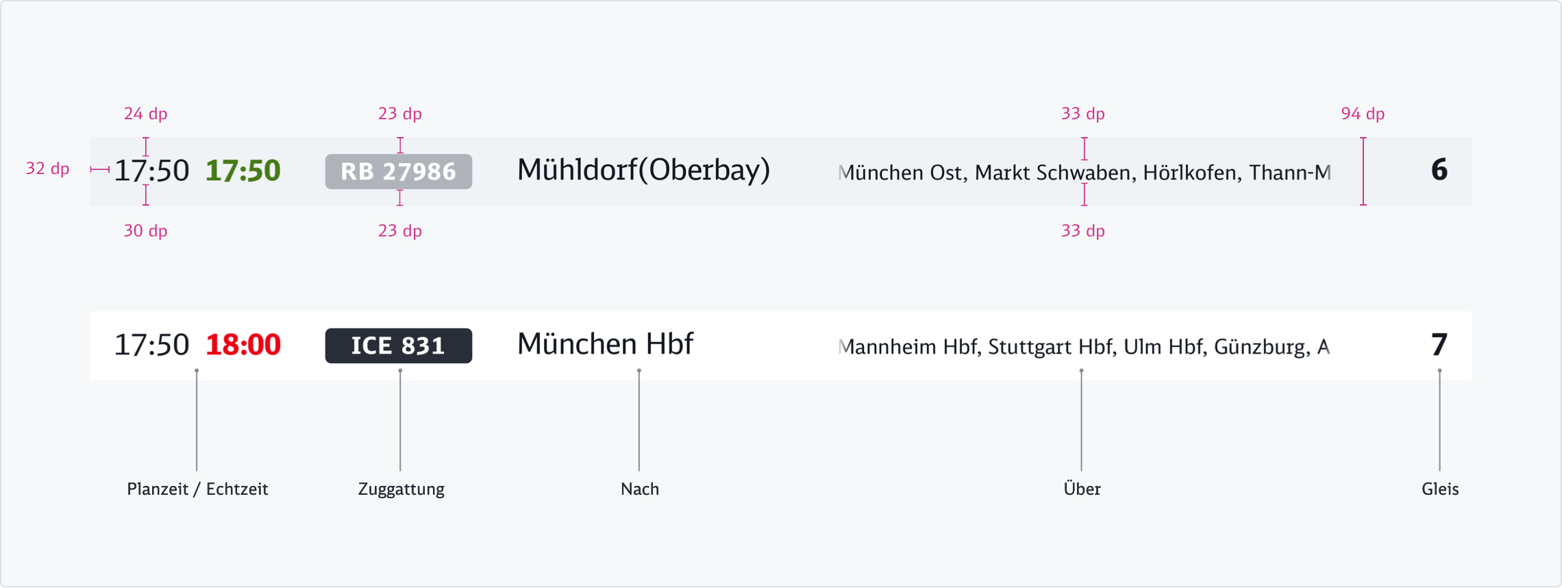 Die geplante Uhrzeit, wann der Zug abfährt, verwendet das Format Body 1 Reg in DB Cool Gray 800. Zeitliche Änderungen werden ebenso in dieser Spalte angezeigt.