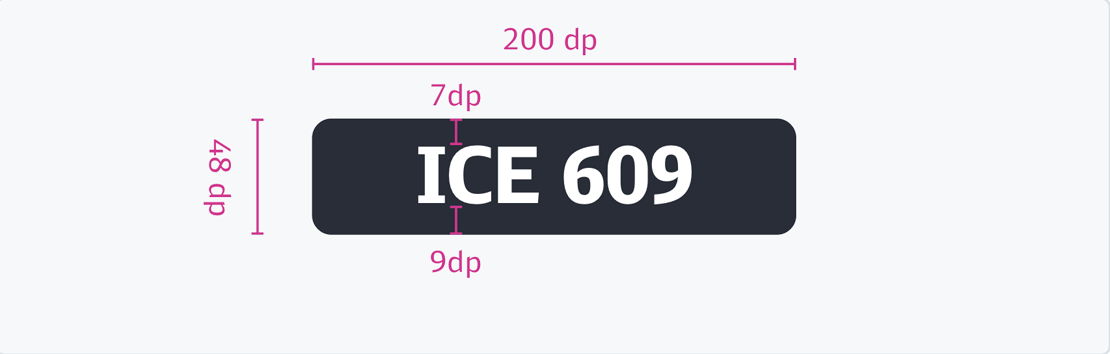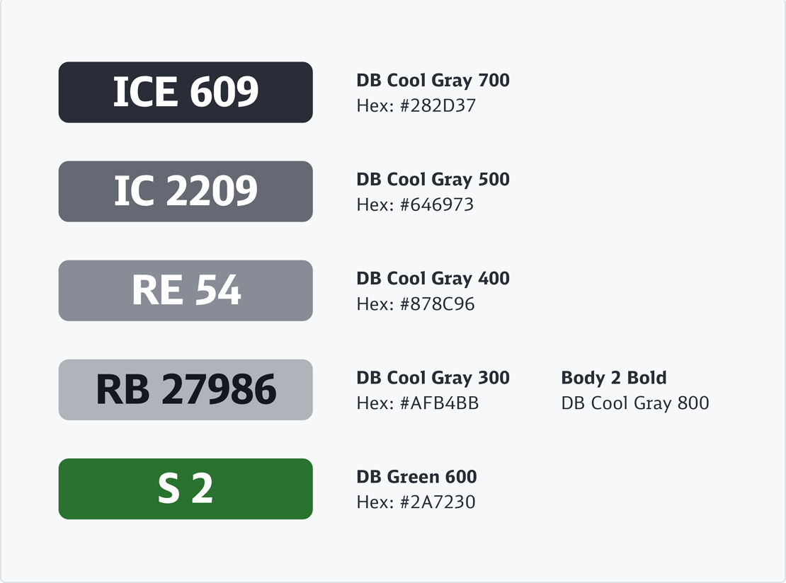 Die verschiedenen Zuggattungen werden durch die Zuggattungs-Chips angezeigt. Diese besitzen eine fixe Breite von 200 dp, welche für eine klare Orientierung sorgt. Die Zuggattungen werden mit max. 3 Buchstaben und max. fünfstelligen Zugnummern im Format Body 2 Bold (32 pt, DB White, bold, center) angezeigt. Um das Kontrastverhalten der Zuggattung RB zu gewährleisten, wurde diese in Body 2 Bold mit Schriftfarbe DB Cool Gray 800 dargestellt. Damit die verschiedenen Zuggattungen auf den ersten Blick erkannt werden können, werden unterschiedliche DB UX Farben eingesetzt. Die Zuggattung IC und EC nutzen dabei dieselbe Farbcodierung DB Cool Gray 500.