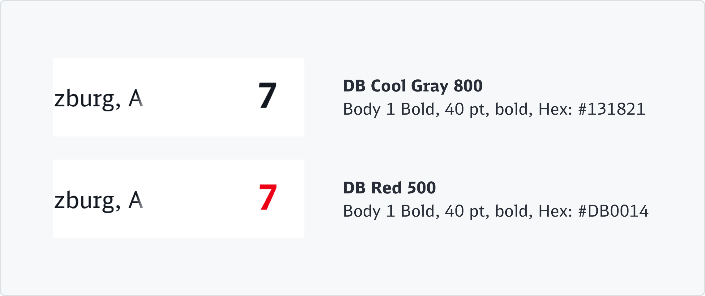 Das Gleis wird als letzte Komponente im Tabellenkopf mit Body 1 Bold angezeigt. Findet ein Gleiswechsel statt, wird dieser mit DB Red 500 farblich hervorgehoben. Je nach Zeilenhintergrund passt sich hier der Rotton an. Siehe Definition Planzeit / Echtzeit oben.