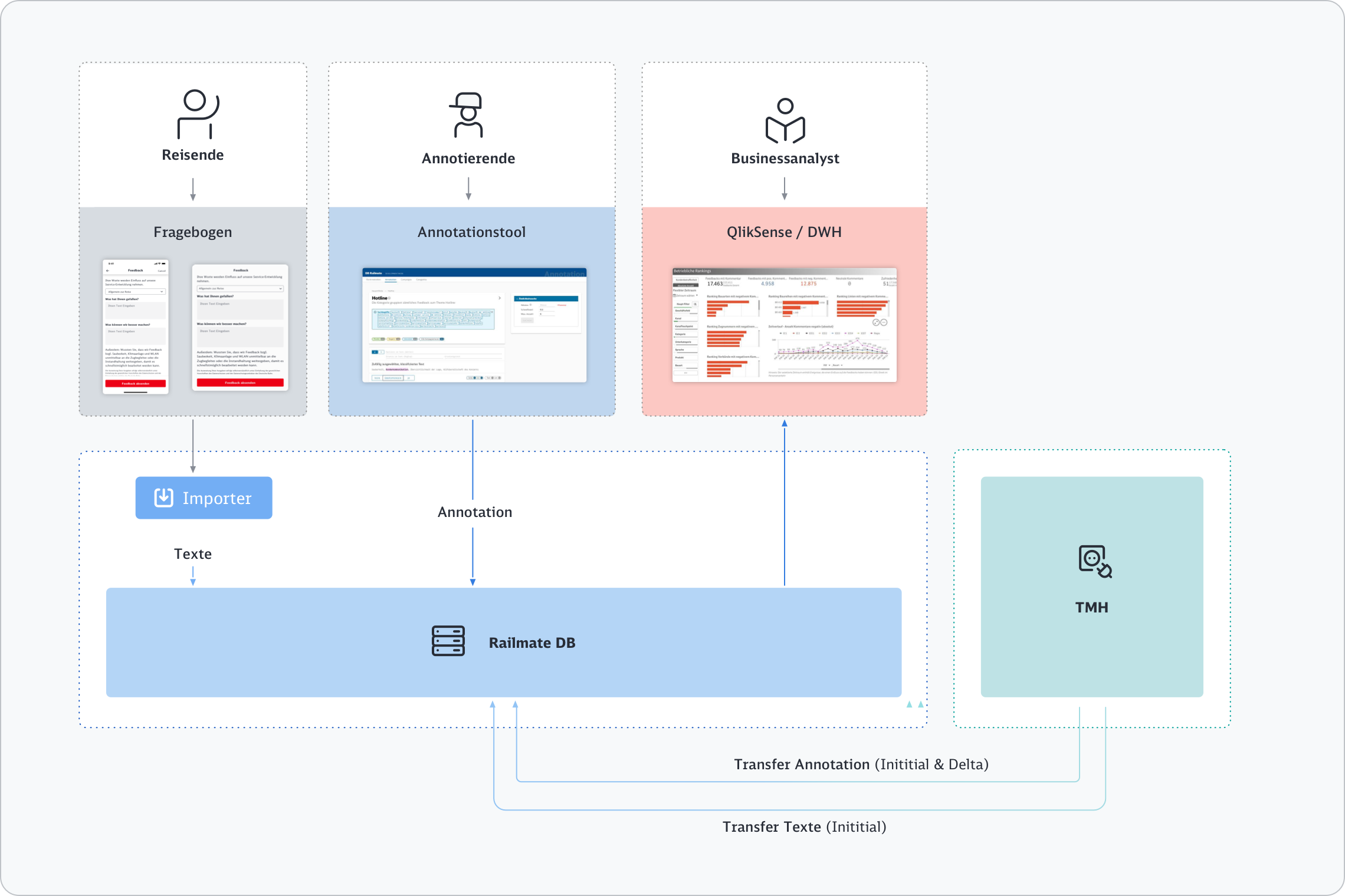 Die Fragebögen werden entweder über Dienstleister oder intern gehostet und bieten die Option der Eingabe über Freitextfelder. Neben den Texten werden die Eingangskanäle, Zeitstempel und weitere betriebliche Informationen (Zug und ggf. Wagen) gespeichert.