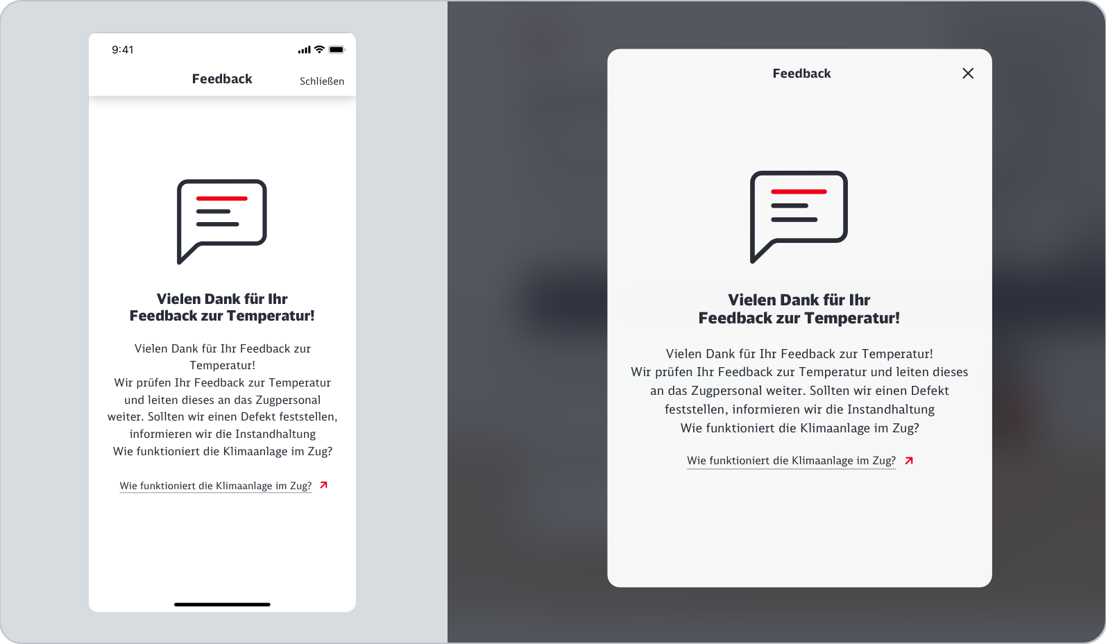 Die Bestätigungsansicht komplettiert das Feedbackgeben. Sie erscheint nachdem Feedbackgebende das Formular über den Feedbackbutton versendet haben. Die Bestätigungsansicht signalisiert zum Einen, dass das Feedback versendet wurde zudem erhalten erhalten Reisende zu ausgewählten Themen kontextualisierte Bestätigungen. Neben dem Dank für ein Feedbackback mit Nennung des Themas, erhalten Reisende eine Erklärung, wie mit Feedbacks zu diesem Thema umgegangen wird. Zusätzlich werden Links mit zu dem Thema relevanten Informationen angezeigt.